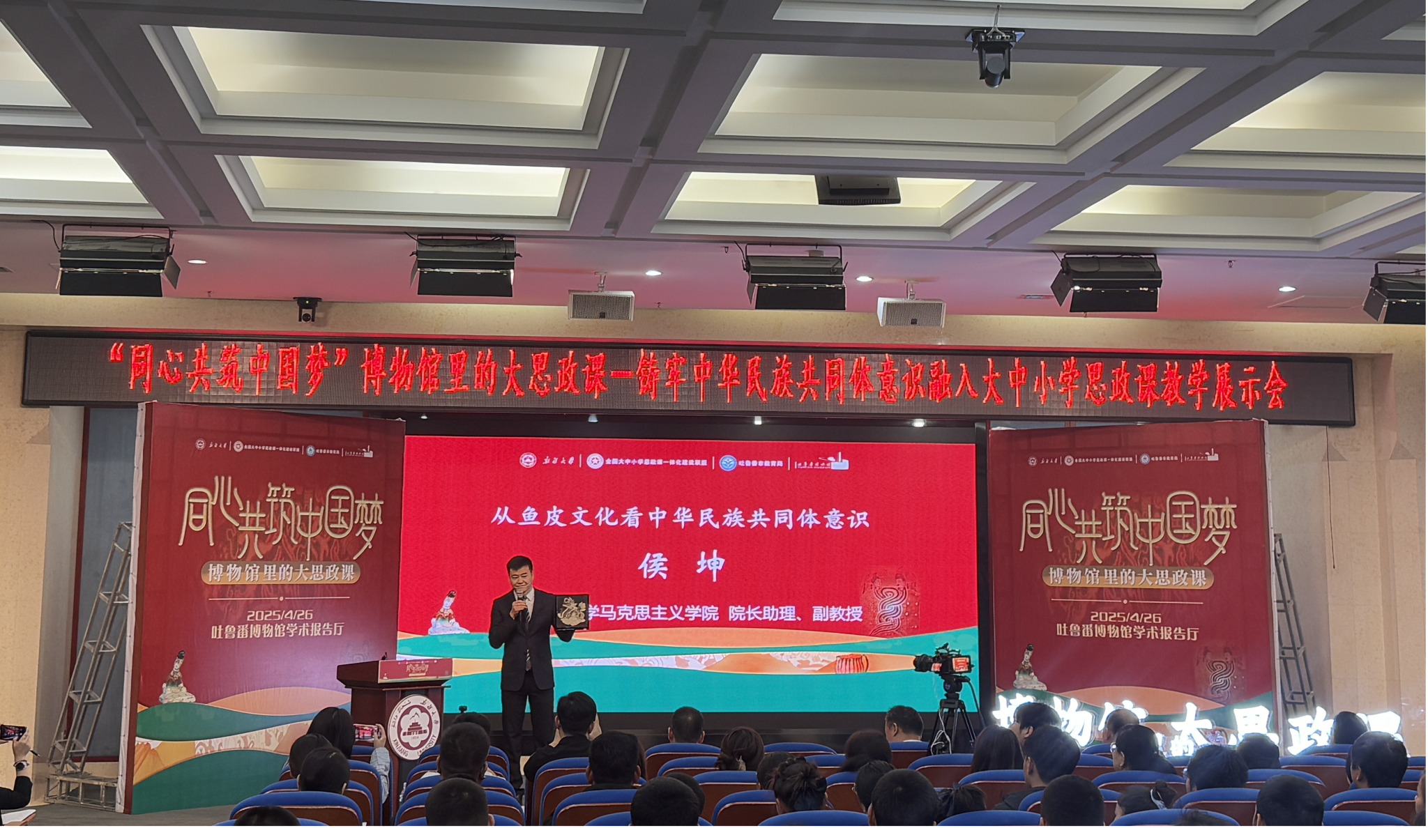 4月26日上午,在吐鲁番博物馆开展的大中小学沉浸式思政教学展示活动中,我校马克思主义学院副教授侯坤作为全国5位特邀疆外教学展示代表之一,以国家级非物质文化遗产赫哲族鱼皮画为教学载体,以博物馆为课堂,通过“非遗技艺+民族团结”的教学设计,生动阐释了各民族在文化交融中形成的命运共同体。以“小切口”展现“大主题”,通过实物展示、互动体验等环节,让历史说话、让文物发声,让现场师生深刻感受到中华优秀传统文化中蕴含的民族团结基因,获得与会专家高度评价,充分展现了我校在思政课教学方面的创新探索与扎实基础。