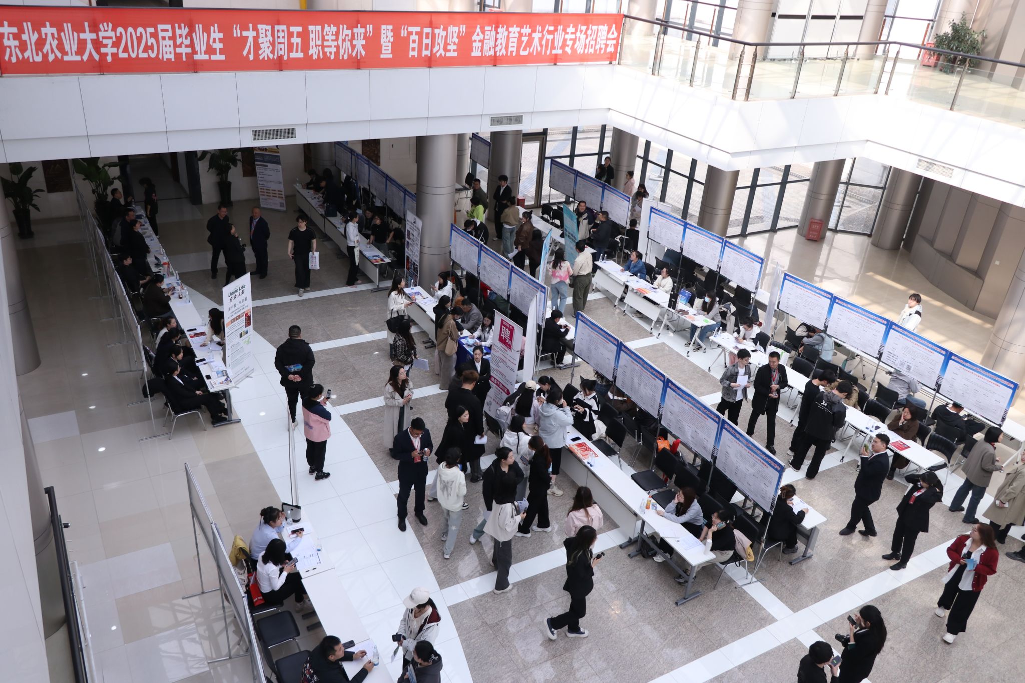 为深入贯彻落实黑龙江省教育厅2025届高校毕业生就业工作推进会议精神,为2025届毕业生高质量充分就业搭建精准对接平台,推动毕业生高质量充分就业,5月9日,招生就业处和校友工作办公室主办,经济管理学院、文理学院、公共管理与法学院、艺术学院、国际文化教育学院、马克思主义学院承办的“才聚周五 职等你来”金融教育艺术行业专场招聘会在音乐厅阳光大厅举办。校党委副书记刘晓峰、招生就业处与校友办负责同志、六个学院领导班子成员和毕业班辅导员参会。