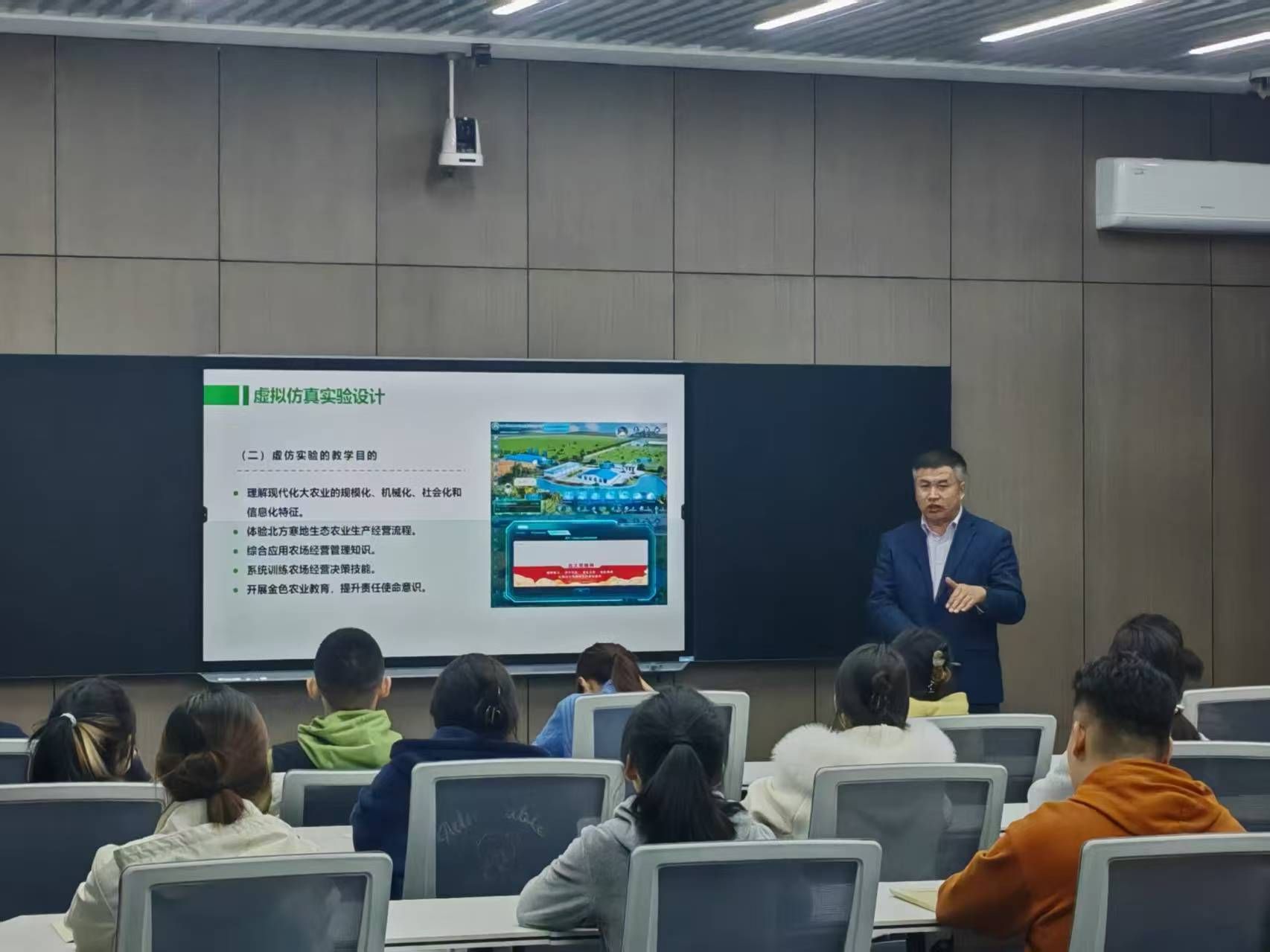 刘家富教授介绍了我校自主研发的“北方寒地生态农场经营决策虚拟仿真实验”的设计理念、功能特点和应用推广过程,分享了实验教学效果。刘家富教授指出,运用虚拟仿真技术高度还原农场经营场景,全程模拟农场决策环节,全方位训练农场决策技能,能有效弥补传统实践教学的不足,为学生提供沉浸式、交互式的学习体验,激发学生的学习热情,训练学生解决动态环境中复杂农场管理问题的能力,切实提高了实践教学效果和人才培养质量。