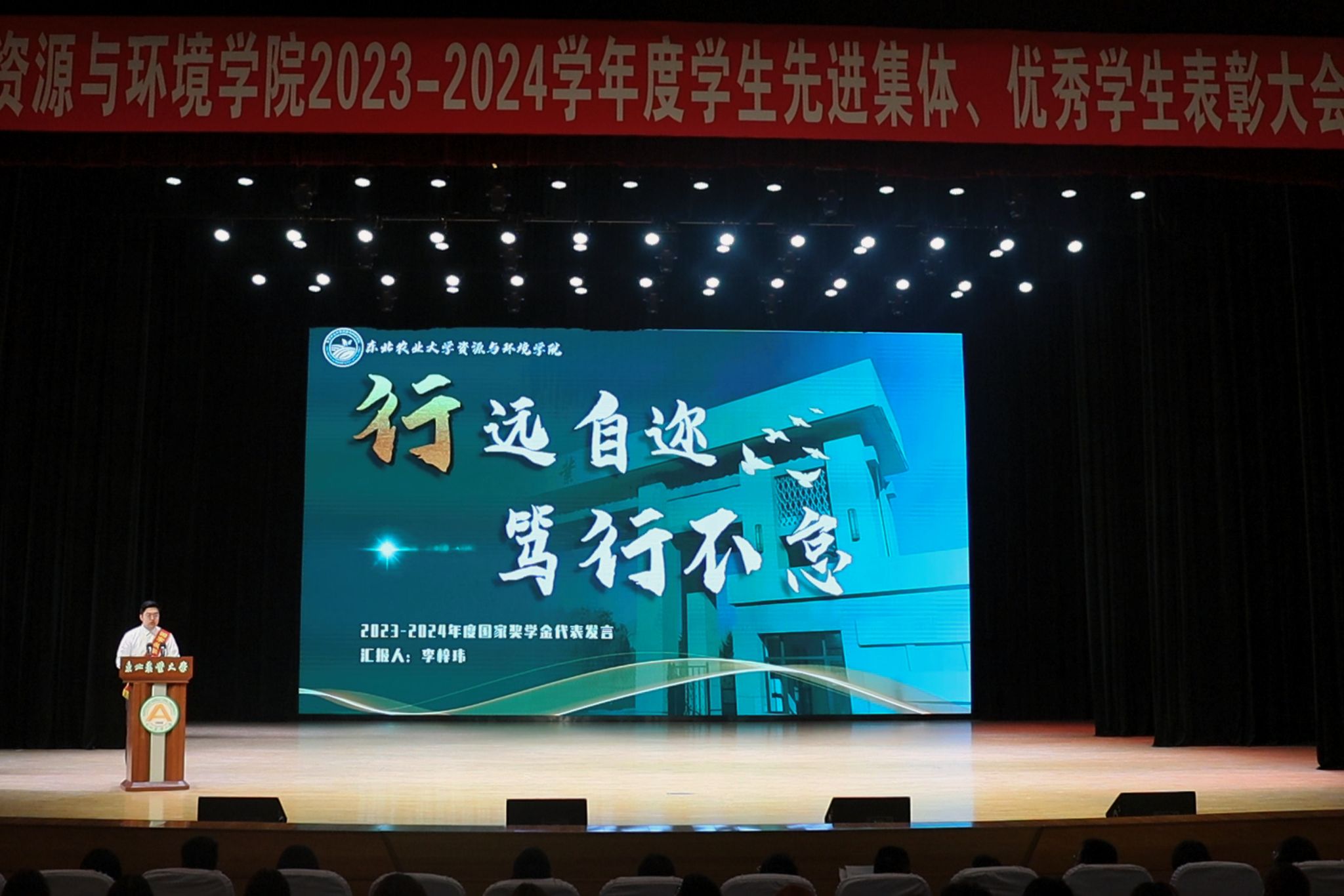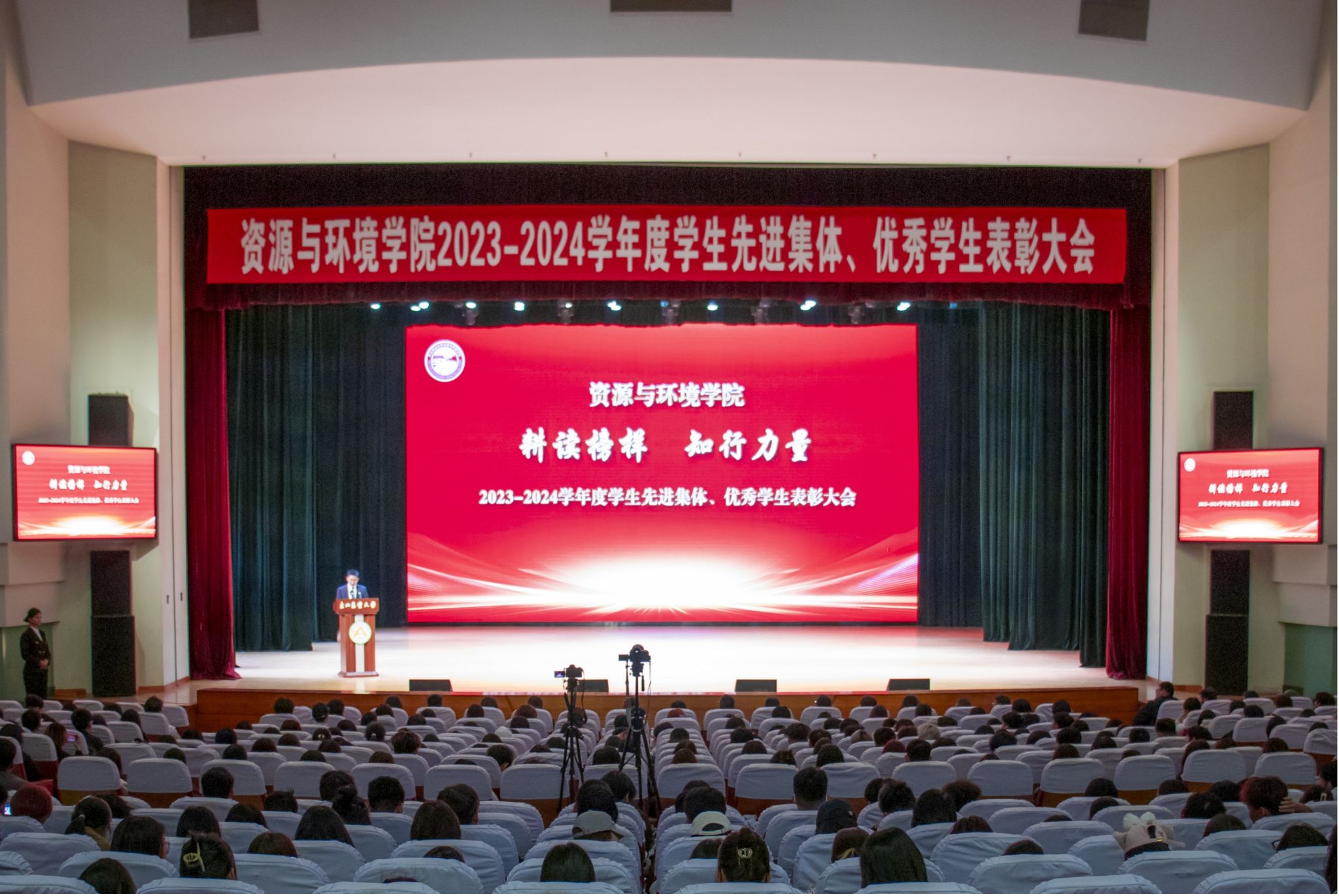 为全面落实立德树人根本任务,凝聚新时代榜样力量,营造争先创优浓厚氛围,5月18日,资源与环境学院“耕读榜样 知行力量”2023-2024学年度学生先进集体、优秀学生表彰大会在音乐厅隆重召开。招生就业处处长潘俊波、学生工作部(学生处、武装部)副部(处)长刘双奇、校团委副书记焦文静,资源与环境学院领导班子、各党支部书记、系主任、全体辅导员以及学院本科生、研究生参会。大会由学院党委副书记袁洪波主持。