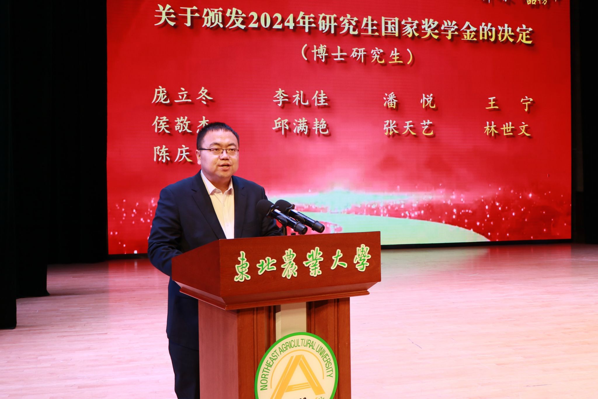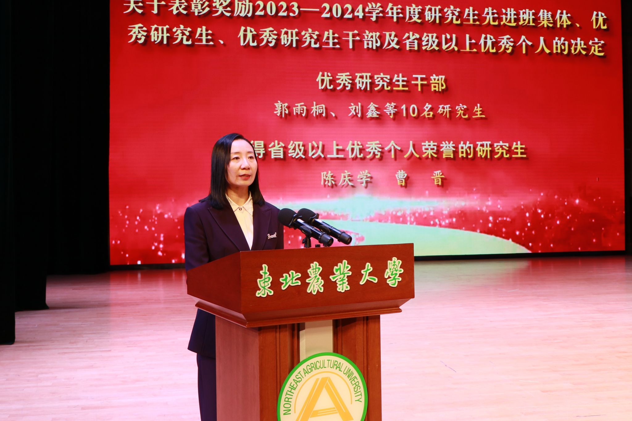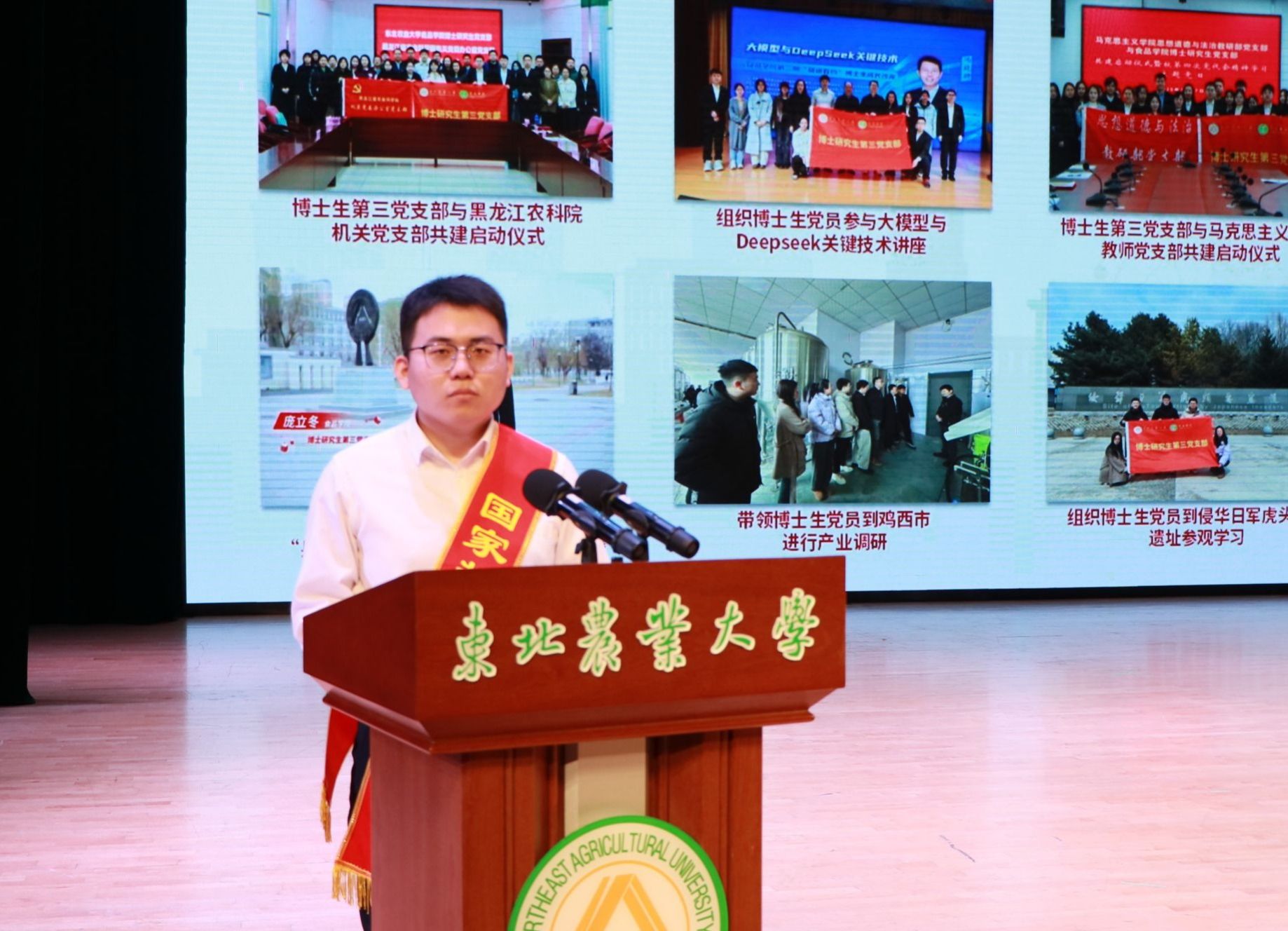 博士研究生国家奖学金获得者庞立冬、大学生年度人物获得者李佳楠、大学生年度群体代表耿仁义分别代表获奖学生和集体发言。他们表示,作为食品学子,要求知敏学、严于律己、追梦不止,要充分发挥专业优势,将个人理想融入国家发展方略,融入龙江振兴需求,融入学校学院建设,用实际行动诠释“何谓青年,青年何为”的时代担当。