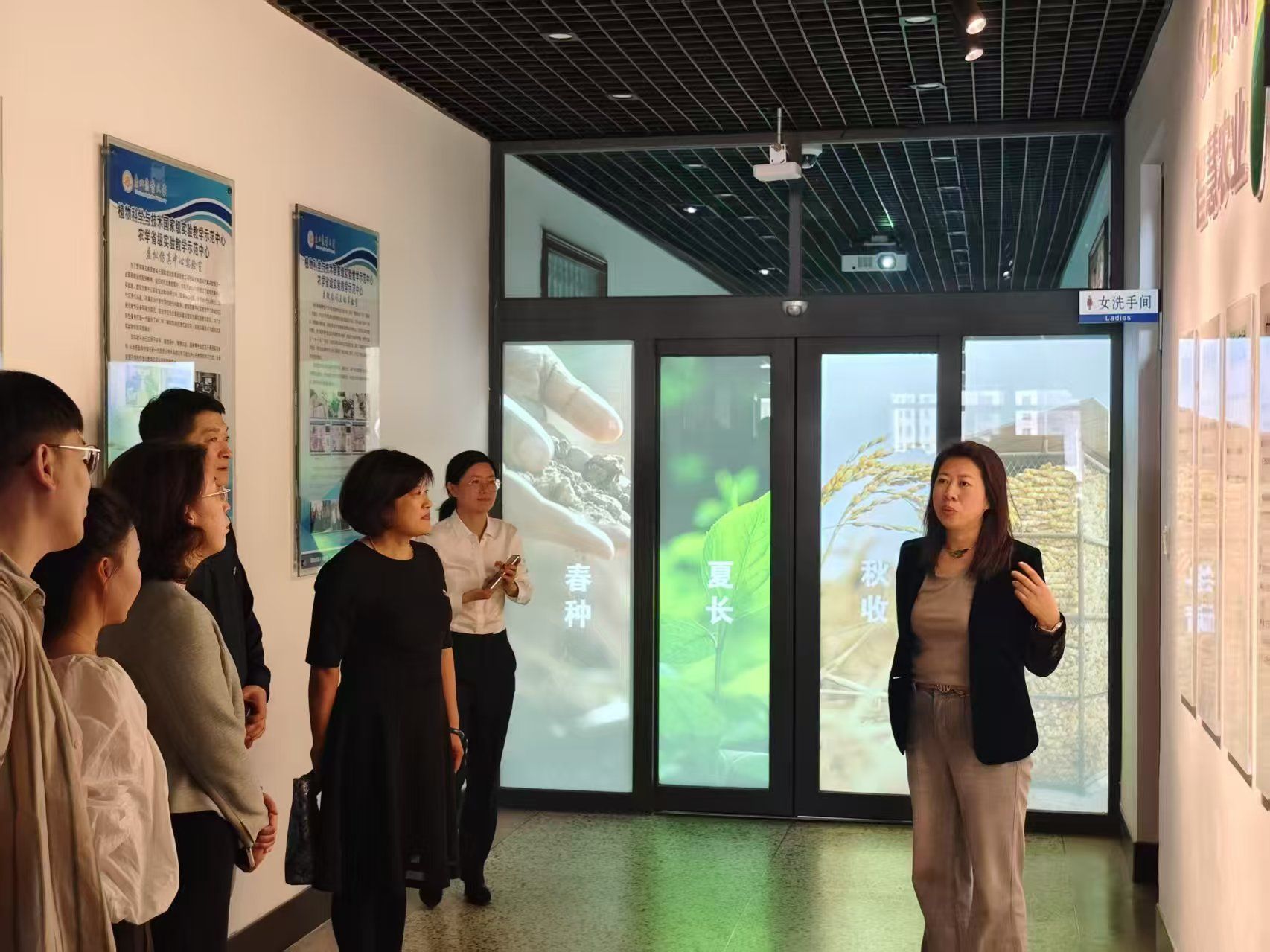 农学院智慧农业系主任魏峭嵘为参会师生作讲解。她围绕智慧农业文化背景介绍、农业的起源与发展、作物信息实验室参观介绍、VR实验室深度体验以及创新实验室五个部分详细介绍了基地在“智慧农场技术与系统全国重点实验室”和“省部共建协同创新中心”等平台建设中的创新成果,并现场展示了农业大数据分析、智能农机装备、精准种植管理等前沿技术应用场景。