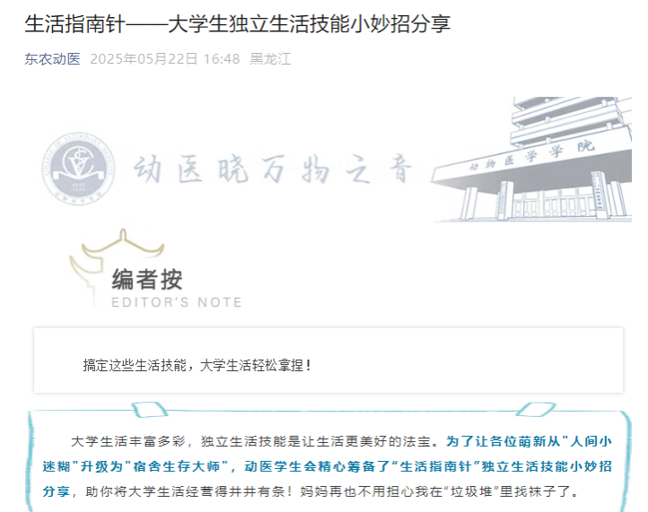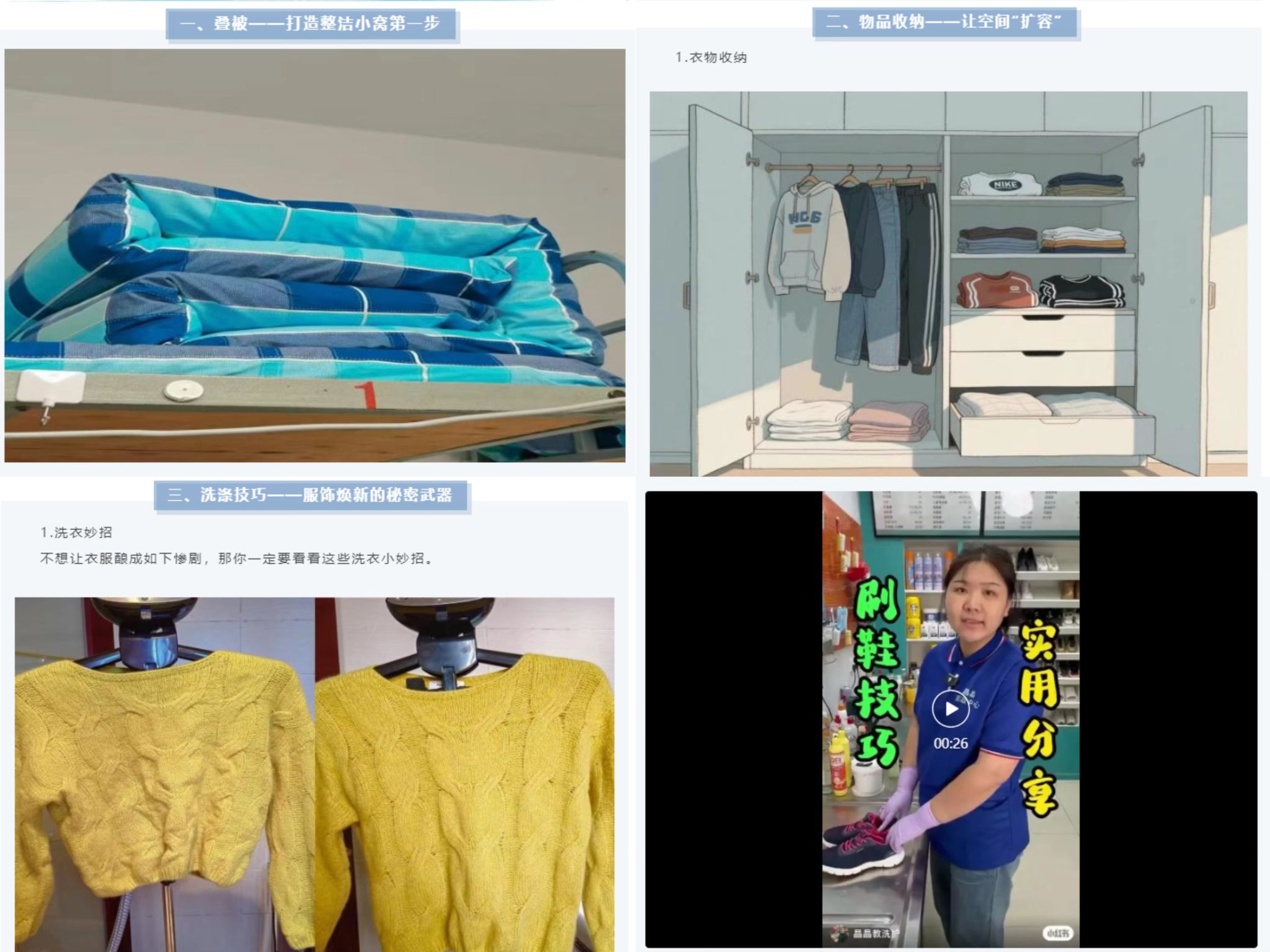 5月22日,“东农动医”微信公众号发布“生活指南针——大学生独立生活技能小妙招”推文进行科普分享,聚焦大学生日常起居需求,围绕叠被子、洗衣服、刷鞋、书桌衣柜整理等基础生活场景分享实用技巧与操作方法,旨在将劳动教育融入学生生活日常,帮助学生掌握生活技能,拓展劳动育人的多维空间。