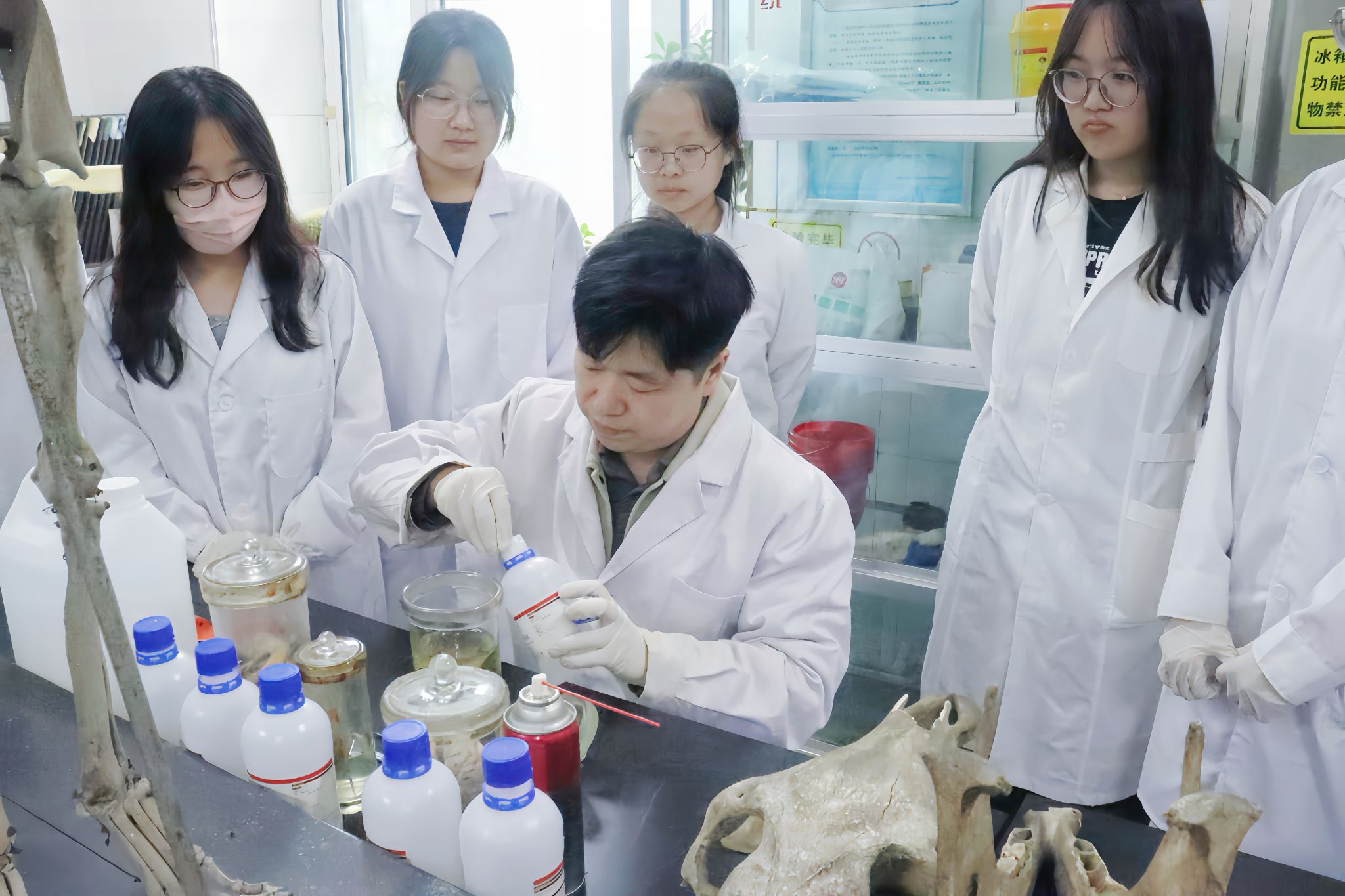 5月21日,学院开展“动植物标本养护专项劳动”实践活动。学院教师单智夫、魏冕现场指导,依托实验室解剖动物标本、中兽医植物标本资源优势,重点围绕标本保存液配制、固定装置调整技术及分类归置进行系统性实践教学。学生对牛、马、犬类等200余件动物解剖标本实施分类整理,完成标本柜玻璃清洁维护、标签信息核查更新、陈列排列优化等任务,掌握了标本管理等专业技能,实现了理论知识与实践能力的有机融合。