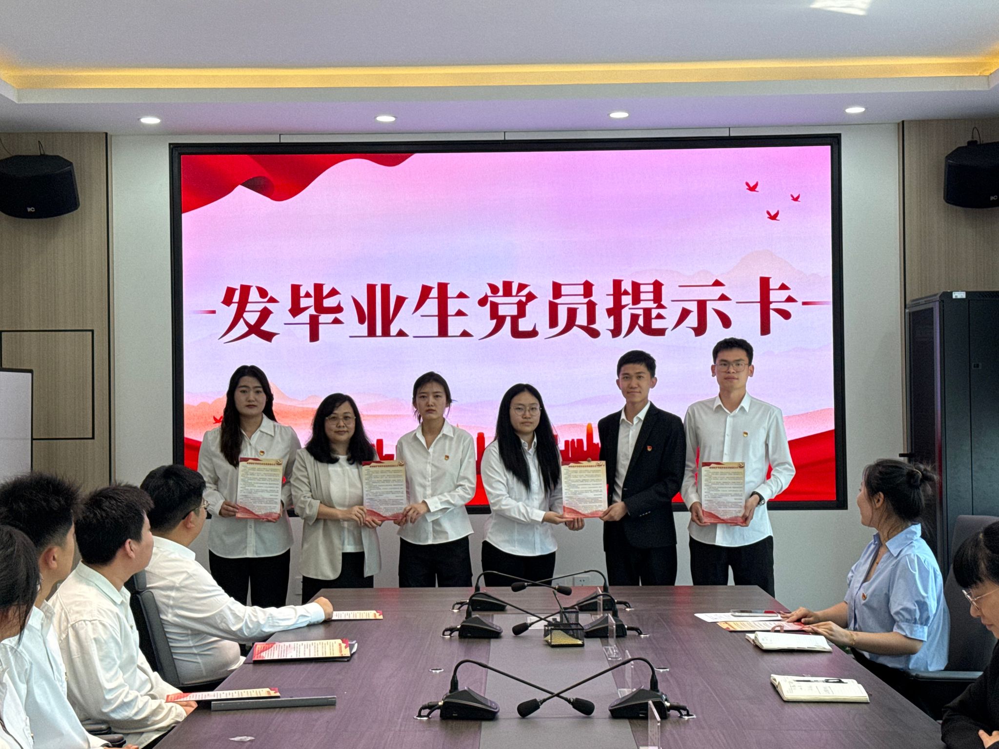 发放党员提示卡,做严于律己的党员。毕业班辅导员张贺、宿亮郑重地为毕业生党员代表发放承载着学院党委殷切期望的党员提示卡。提醒毕业生党员在未来的人生道路上,时刻铭记党员身份,以党员的标准严格规范自身言行,积极发挥先锋模范作用,为党和人民的事业不懈奋斗。