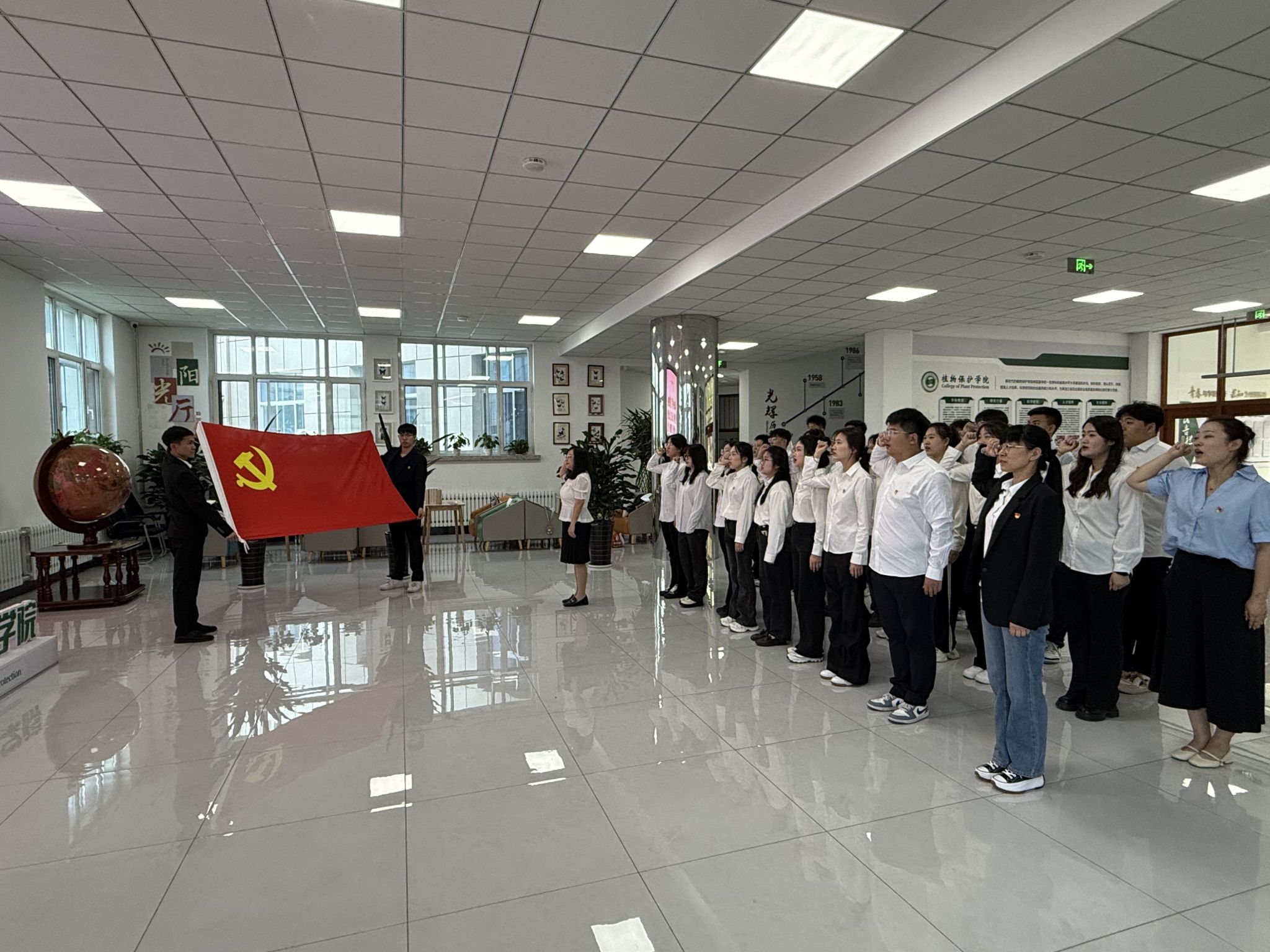 张贺领誓,全体毕业生党员面向党旗,整齐列队,重温入党誓词,一句句誓言掷地有声,响彻会场。