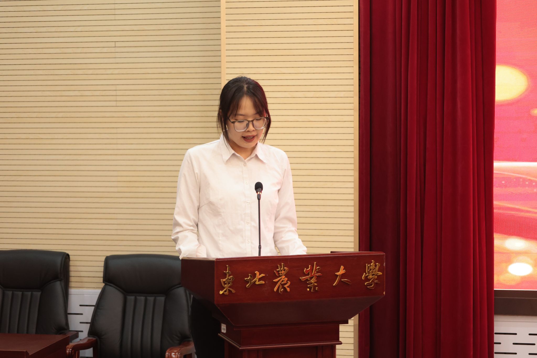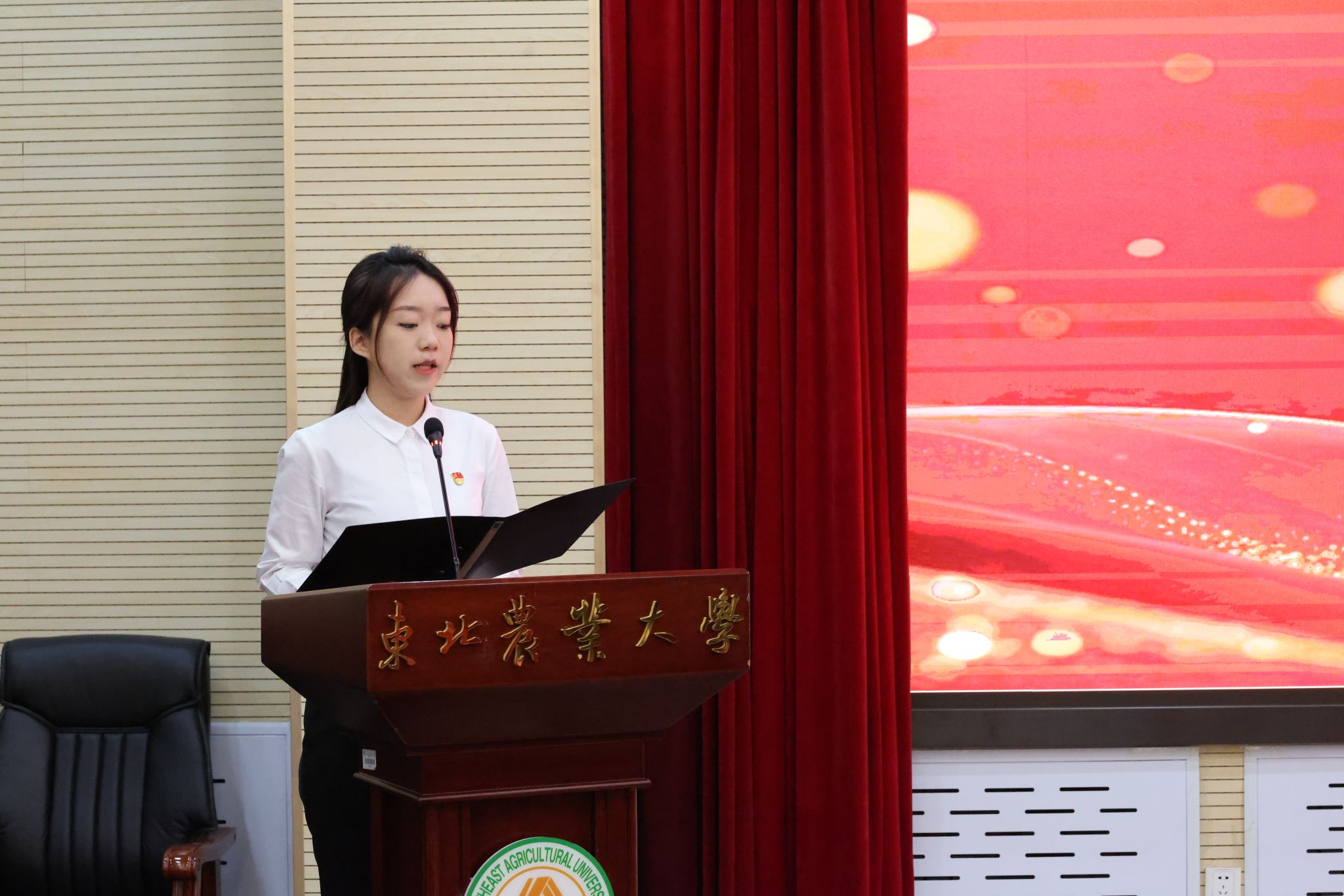 杨石穿代表学院向获得荣誉的集体和个人表示祝贺,对全院教师的辛勤付出表示感谢。他表示,希望全体同学始终牢记习近平总书记对新时代青年的殷切希望,要坚定理想信念、练就过硬本领、肩负时代重任、锤炼品德修为,将传承弘扬东农精神内化为成长基因密码,将提升国际胜任力作为自身发展的核心目标,做燎原之火的传承者、鲲鹏展翅的追梦人、浪花奔涌的弄潮儿、向阳而生的参天树,挺膺担当、接续奋斗,在强国建设、民族复兴伟业的征程中贡献东农国际人的力量。