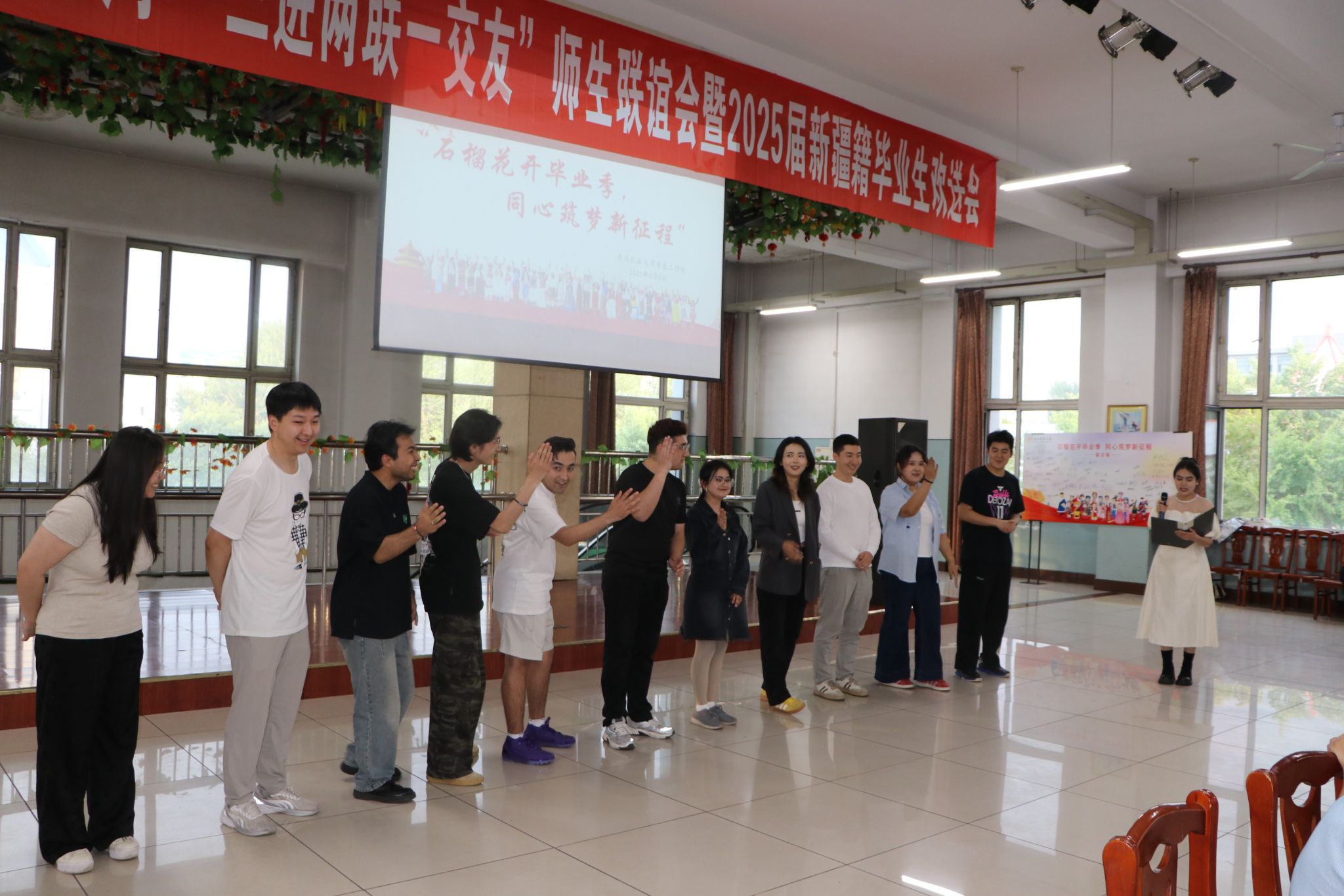 为铸牢中华民族共同体意识的战略部署,推动新时代党的民族政策在校园落地生根,6月6日下午,我校在学生第三食堂三楼举办“三进两联一交友”师生联谊会暨2025届新疆籍毕业生欢送会。学生工作部副部长刘双奇、学生工作部辅导员队伍建设科科长黄月明、少数民族专职辅导员、各学院结对辅导员以及全体在校新疆籍少数民族学生参加活动。