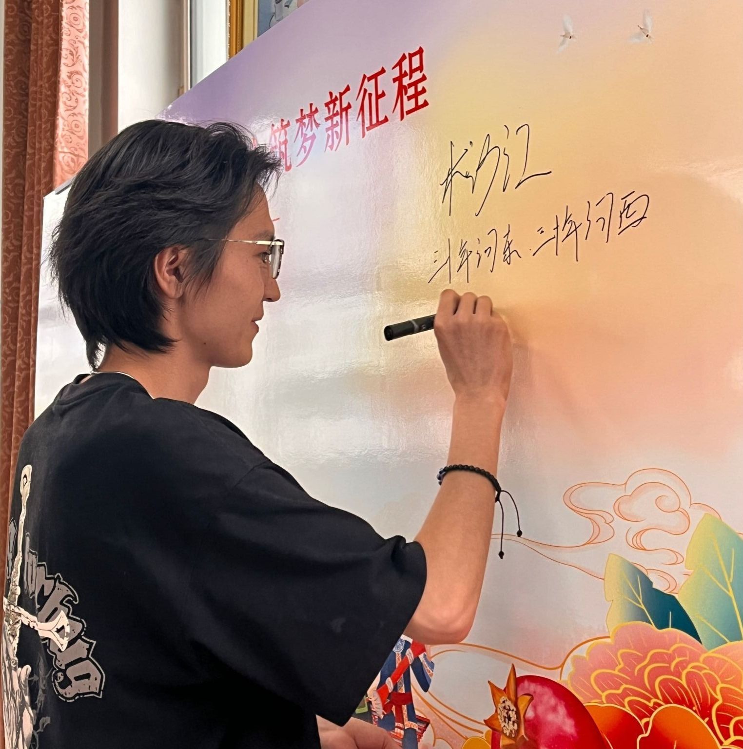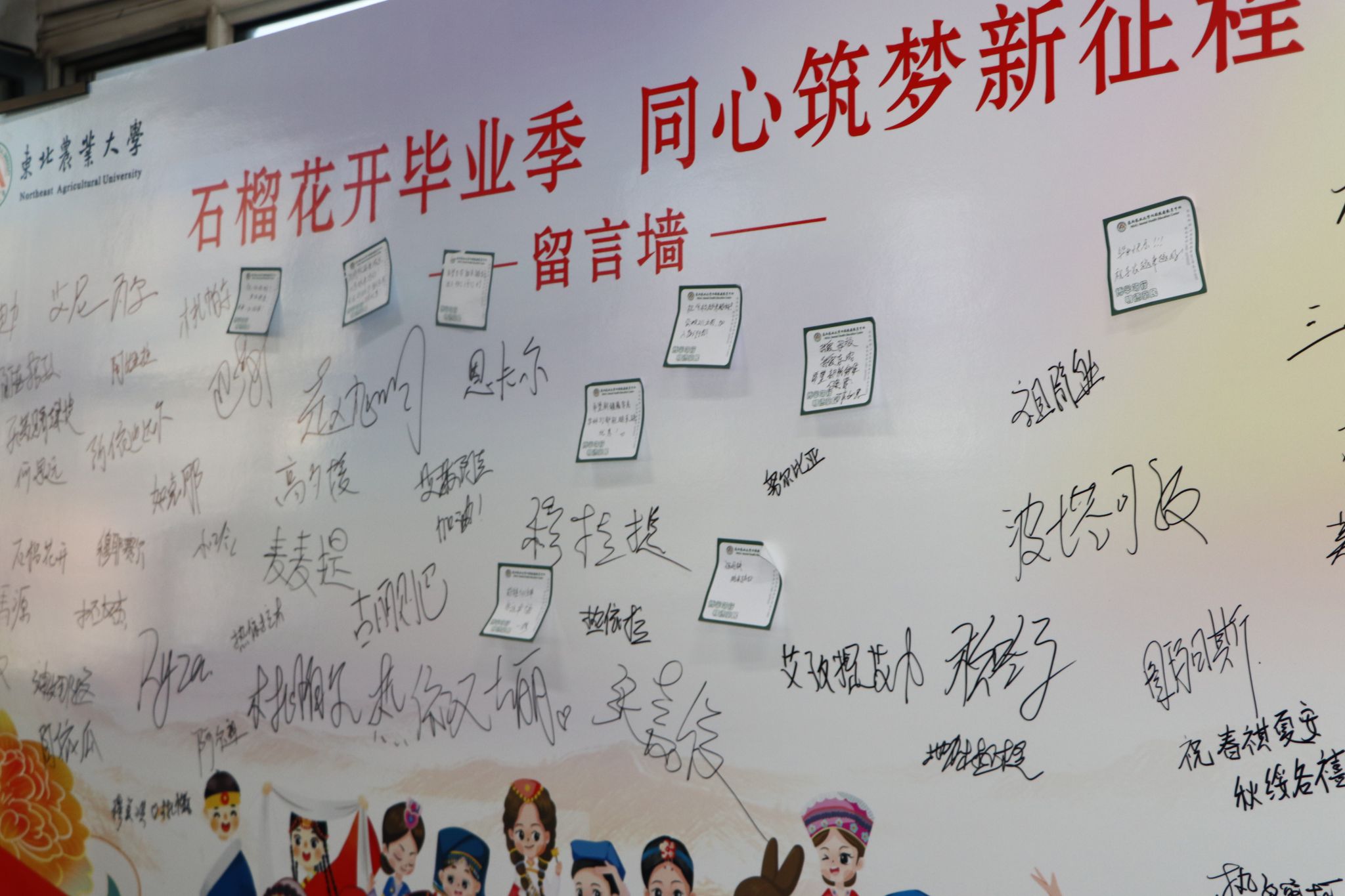 活动现场入口处布置了留言墙。少数民族学生与嘉宾们以签名、暖心寄语等个性化方式留下珍贵印记。活动伊始,刘双奇对毕业生发表寄语,倡导同学们传承各民族“守望相助”的优秀品质和各民族心连心、同呼吸、共命运的优良传统。他强调,青年一代要将个人奋斗的“小目标”融入党和国家事业的“大蓝图”,希望同学们将“博学笃行 明德亲民” 的校训铭刻于心,成为东农精神的传播者,以豁达之心面对挑战,以坚定信念锚定人生方向,让青春在时代征程中绽放光芒。