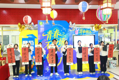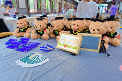 文艺演出在毕业生合唱《凤凰花开的路口》中拉开序幕,学联诗朗诵《致我们的青春岁月》倾诉不舍,辅导员活力演绎《向快乐出发》点燃全场。定制小熊、行李牌等抽奖礼物传递学院关怀。活动现场遍布“手工爱意”的巧思。奶粉罐变身憨态可掬的小蜜蜂,纸壳化作巨型“蛋糕”与“冰激凌”,充气球搭配麻绳成悬浮“热气球”,PVC水管喷涂成绚烂“烟花”,水桶变身可爱“酸奶桶”……这些师生变废为宝的设计,无声诠释着“装满行囊再出发”的期许。