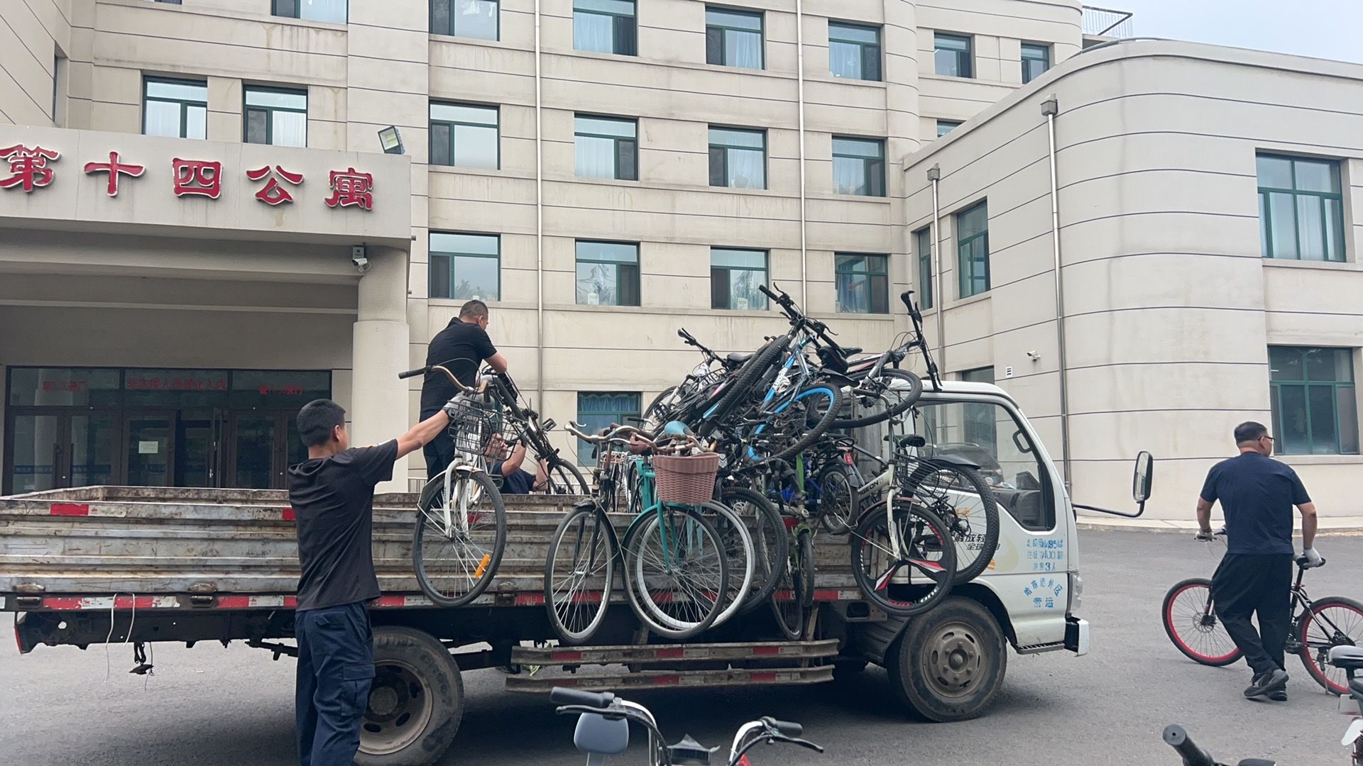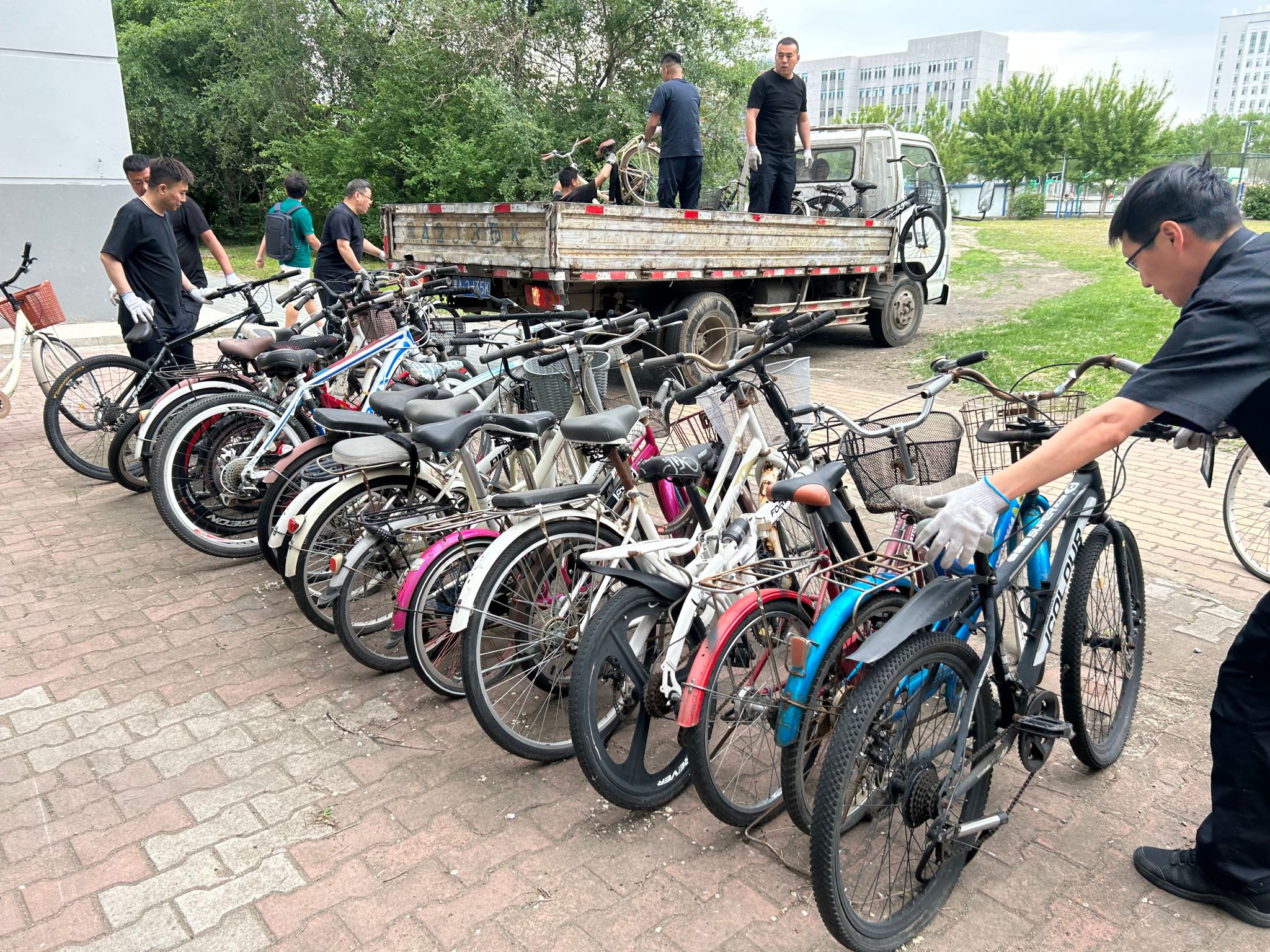 为做好此次专项整治行动,保卫处提前谋划,深入学校各公共区域和学生公寓门前,对长期闲置停放的车辆进行确认与数量统计,做到心中有数。同时做好安排拉送车辆,明确登记搬运人员,选定集中停放地点等前期工作,采取“先集中,后处理”的措施,对有人来认领的车辆按规定登记处理,对长时间无人认领的车辆,为了避免“误清理”状况的发生,集中存放后再根据学校相关规定处理。6月6日上午,保卫处按照既定工作部署,对校内无主废弃自行车统一进行了集中拖移、统一保管,做到分工明确、流程规范、方法科学。