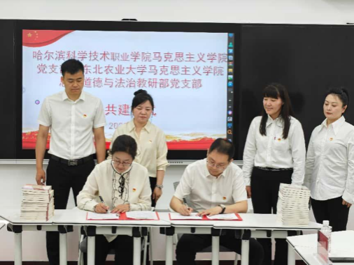 双方介绍了各自党支部建设情况,刘艳芳宣读了《支部共建实施方案》,哈尔滨科学技术职业学院马克思主义学院院长李猛与赵继颖现场签订共建协议书,正式开启“理论共研、实践共创、组织共建、资源共享”的“四共”合作新模式。