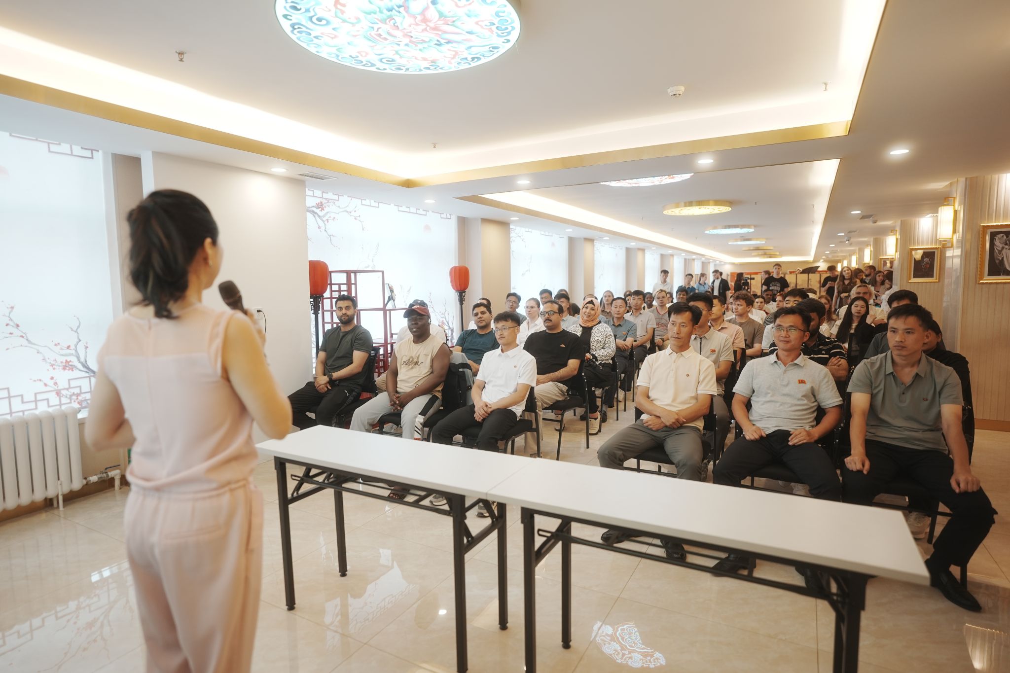 6月18日,国际文化教育学院组织六十余名来自俄罗斯、巴基斯坦等十个国家的留学生走进黑龙江省京剧院,开展了一场沉浸式的京剧文化体验活动。活动现场,黑龙江省京剧院演员陈骥老师为留学生们带来了一场生动详实的讲解。她结合自身表演经历,从京剧的起源、发展脉络讲起,深入浅出地介绍了生、旦、净、丑四大行当的艺术特点,并辅以经典剧目的内容解析,帮助留学生建立起对京剧艺术的整体认知。现场气氛热烈,掌声不断。
