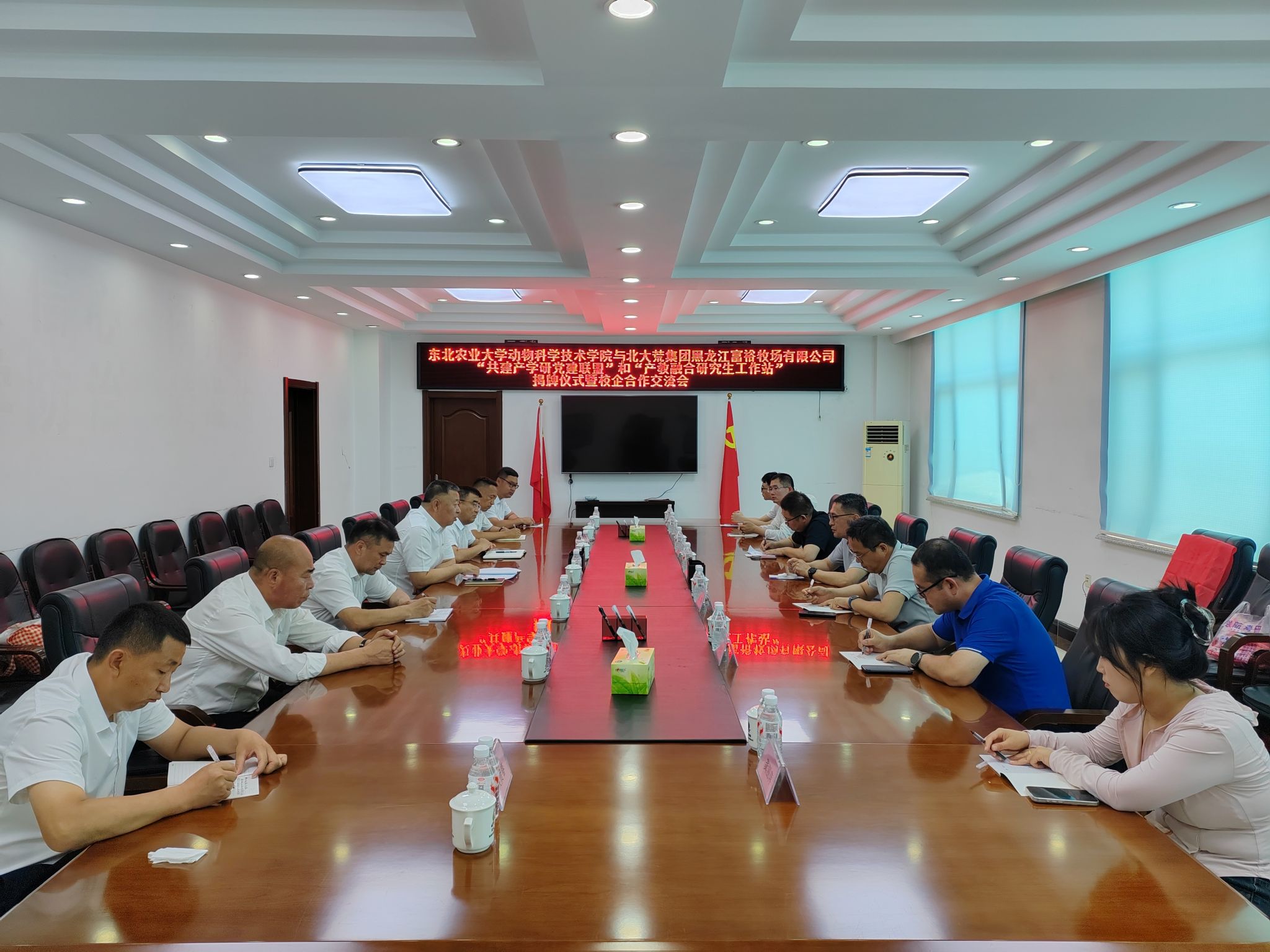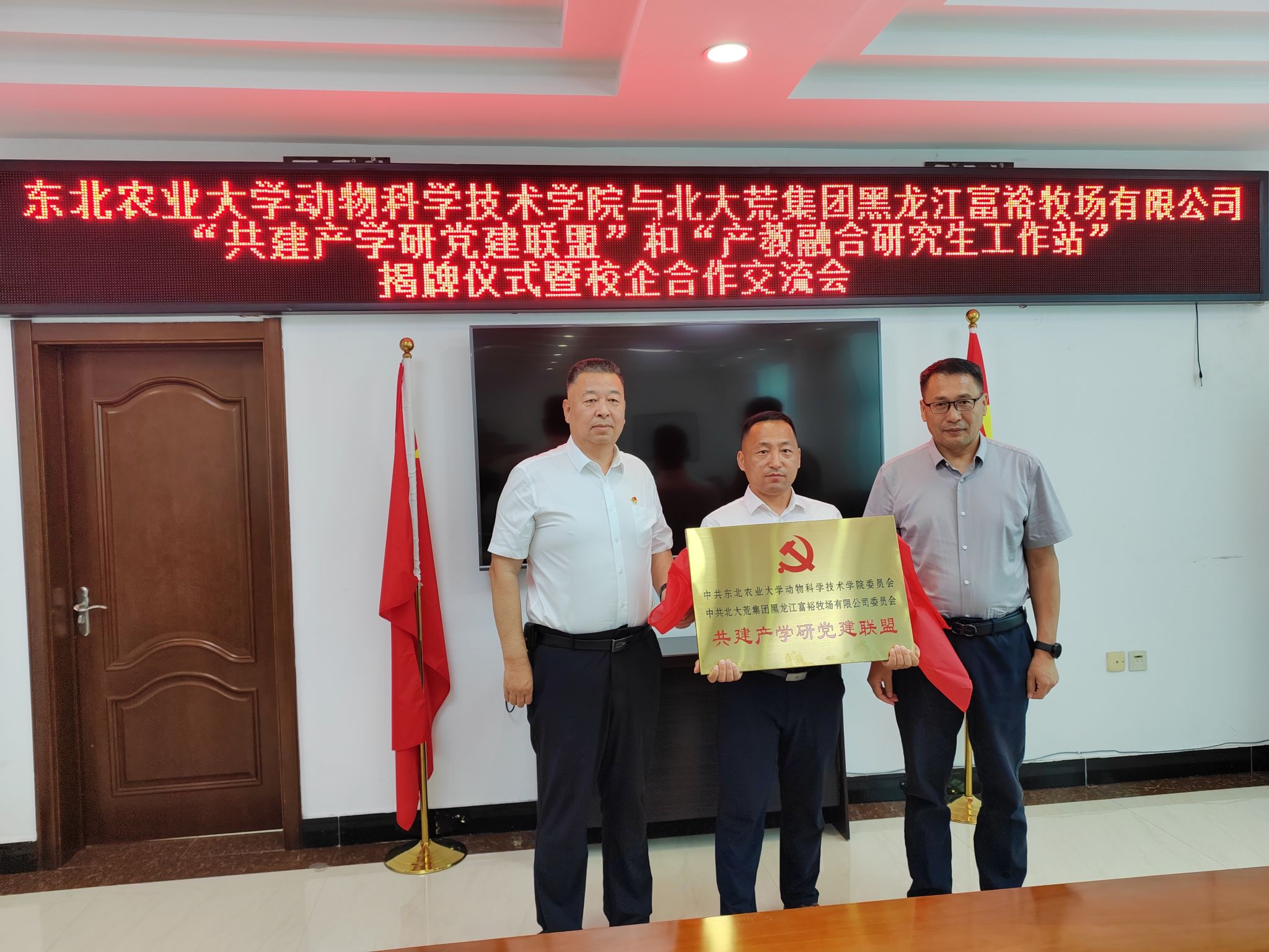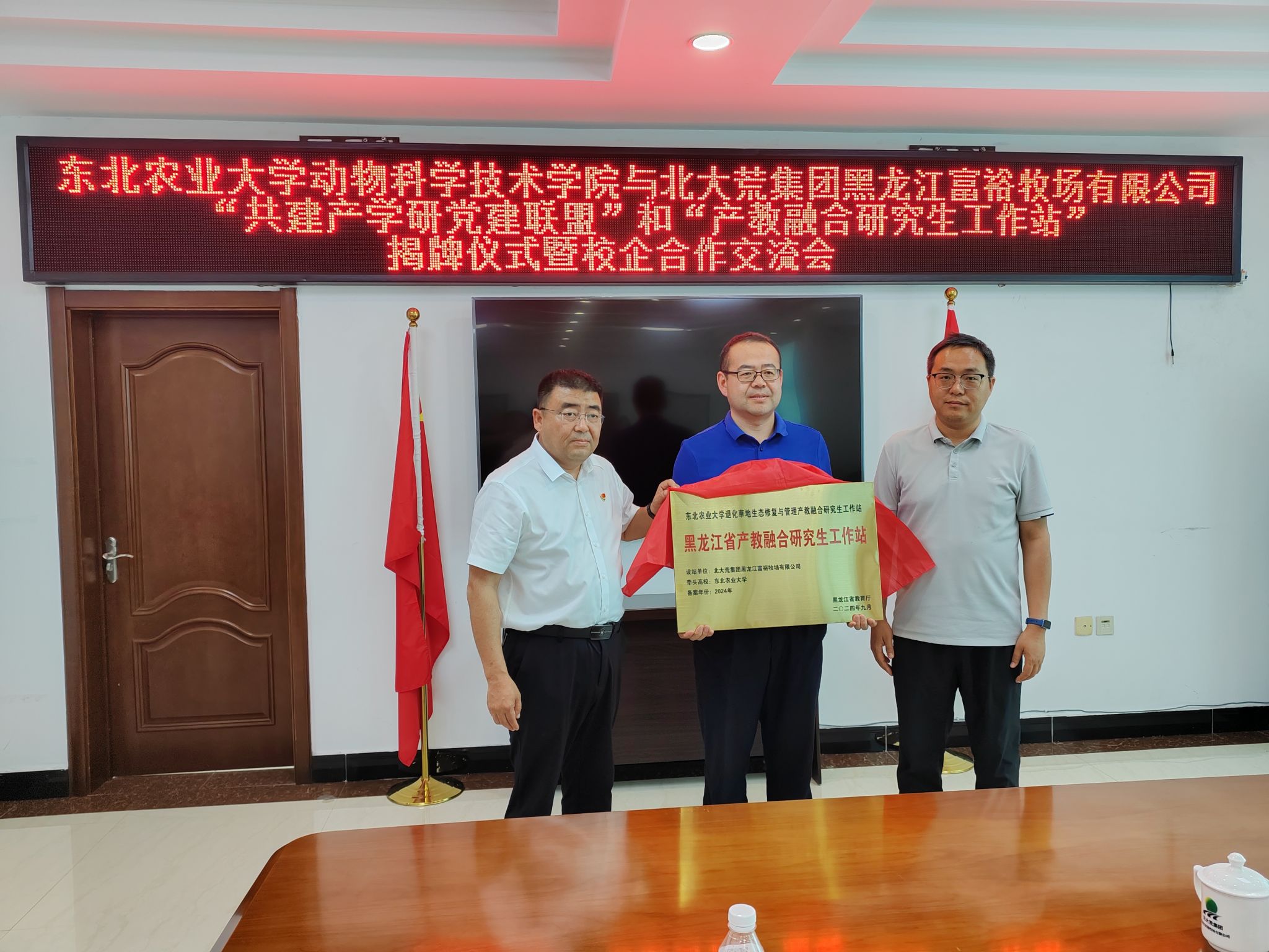 为深入学习贯彻党的二十届三中全会精神,贯彻落实我校第四次党代会精神,深化高校与企业合作交流,推动党建与业务深度融合,6月24日,动物科学技术学院赴北大荒集团黑龙江富裕牧场有限公司开展共建产学研党建联盟和产教融合研究生工作站揭牌仪式。动物科学技术学院党委书记徐光君、副院长张攀、研究生院专业学位教育管理办公室副主任于文皓、草业科学系教师党员代表、研究生代表、富裕牧场有限公司党委书记耿春、总经理陆惠龙等参加揭牌仪式,活动由耿春主持。