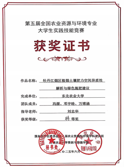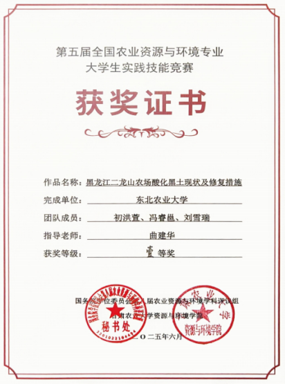 近日,我校资源与环境学院副教授刘志华指导的“绿壤空间研究组”在第五届全国农业资源与环境专业大学生实践技能大赛决赛中荣获特等奖。由资源与环境学院院长曲建华指导的学生初洪萱、冯睿邕、刘雪瑞获得一等奖。本次比赛吸引全国48所涉农院校的318支团队参加,通过匿名评审选出50支团队入围决赛,我校参赛团队脱颖而出,充分展现了我校在农业资源与环境学科专业的育人成效。