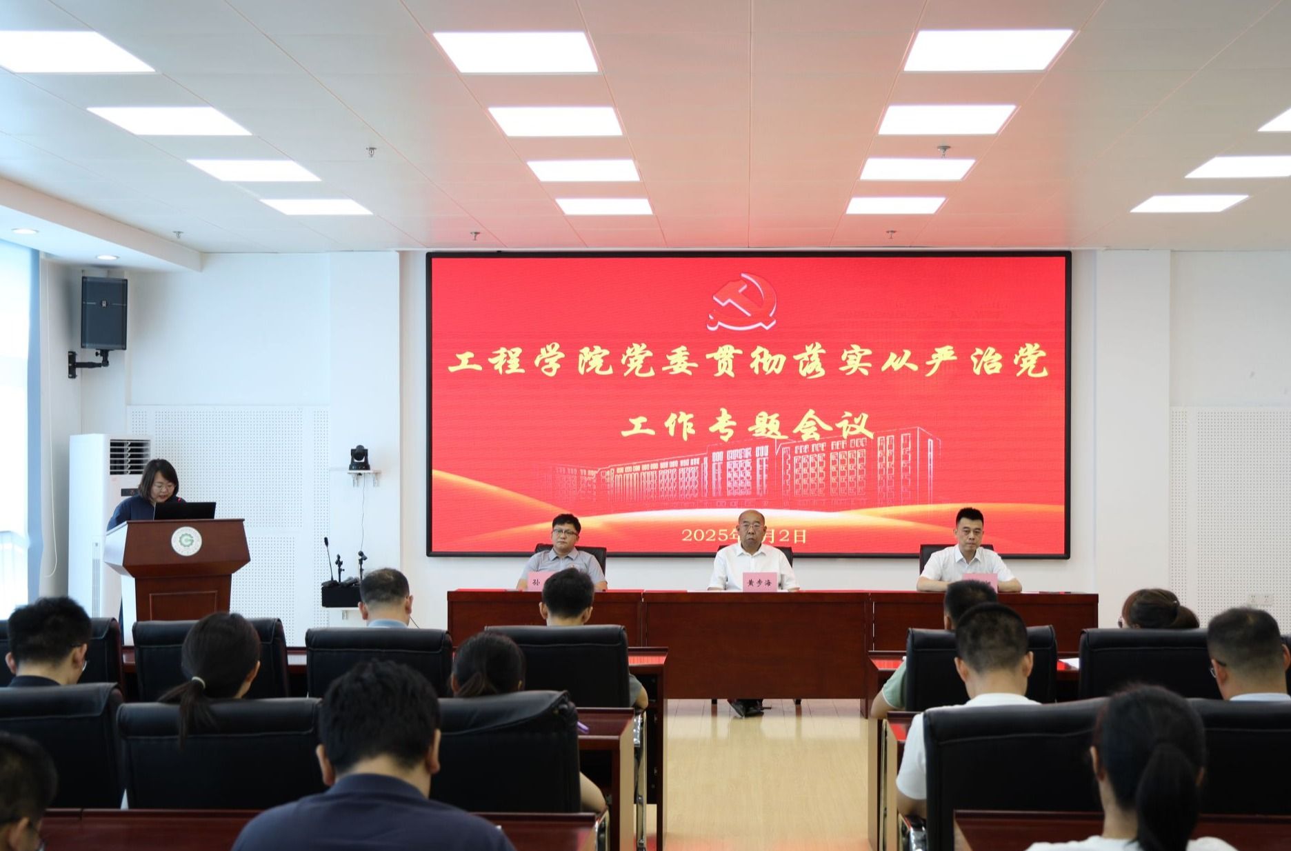 7月2日,工程学院党委在工程楼522会议室召开贯彻落实全面从严治党工作专题会议。学院领导班子成员、全体教工党支部书记、系(部、中心)主任、副主任、副科级以上干部及全体辅导员参会。会议由学院党委副书记孙涛主持。