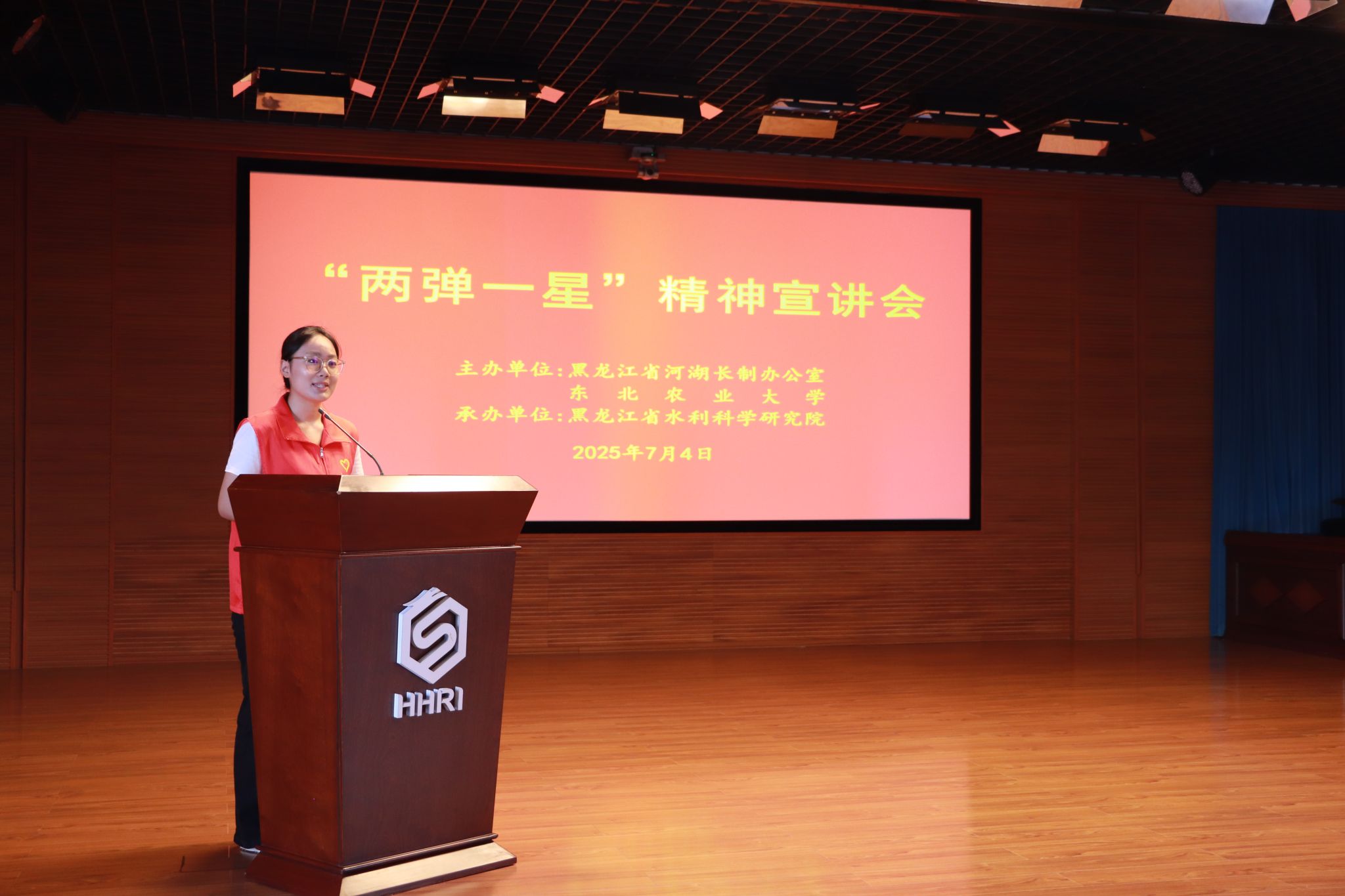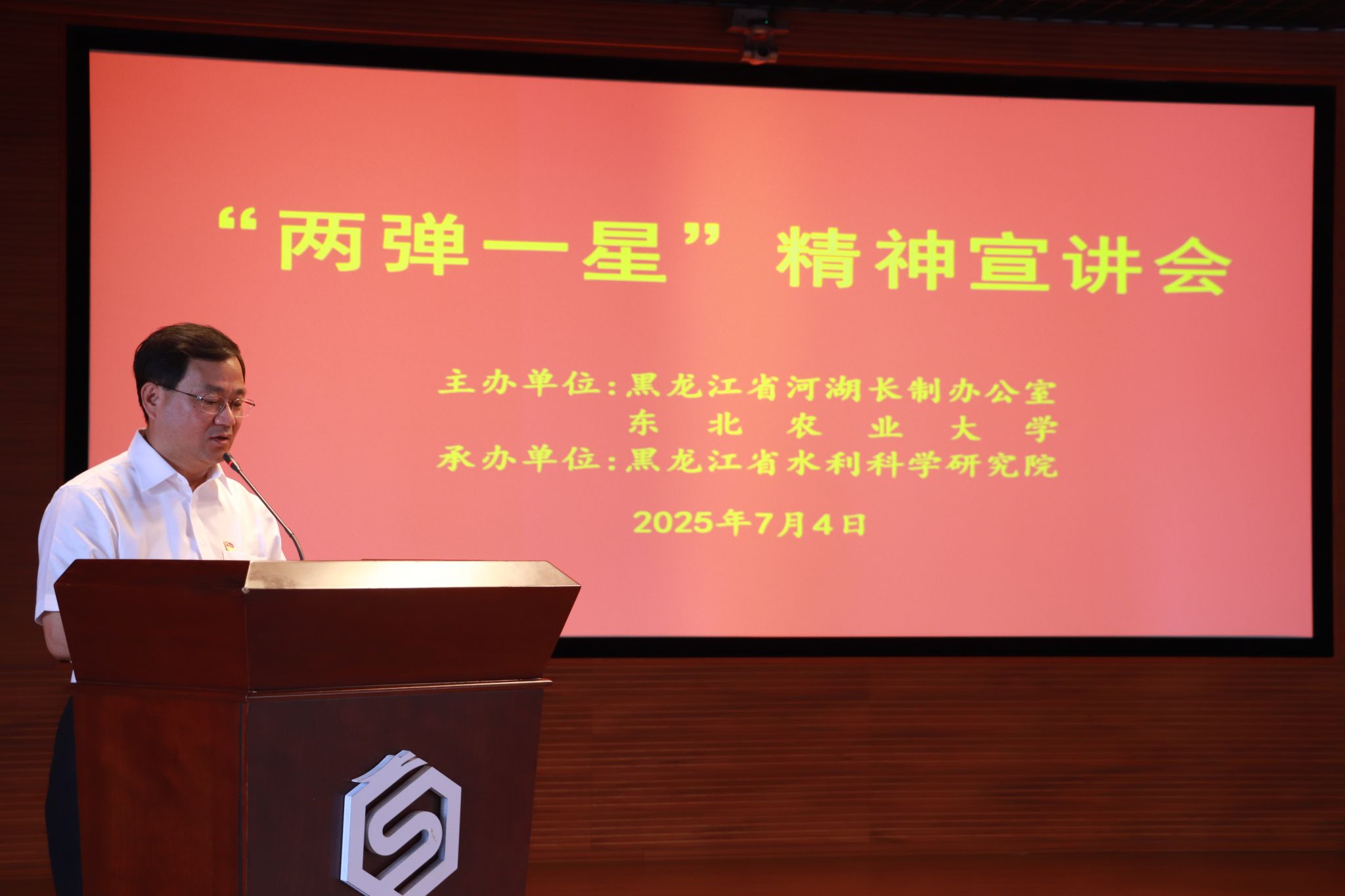 为热烈庆祝中国共产党成立104周年,深入学习贯彻习近平新时代中国特色社会主义思想,全面贯彻落实党的二十大和二十届二中、三中全会精神,大力弘扬和传承“两弹一星”精神,7月4日,公共管理与法学院“铸剑为犁”志愿宣讲团赴黑龙江省水利科学研究开展“两弹一星”精神宣讲活动。黑龙江省水利厅党组成员、副厅长、省河湖长制办公室副主任韩福友,工作处处长张洪斌,我校公共管理与法学院党委副书记赵文和、水利与土木工程学院副院长李天霄出席活动。黑龙江省水利科学研究院党委书记、院长高士军主持活动并致辞。