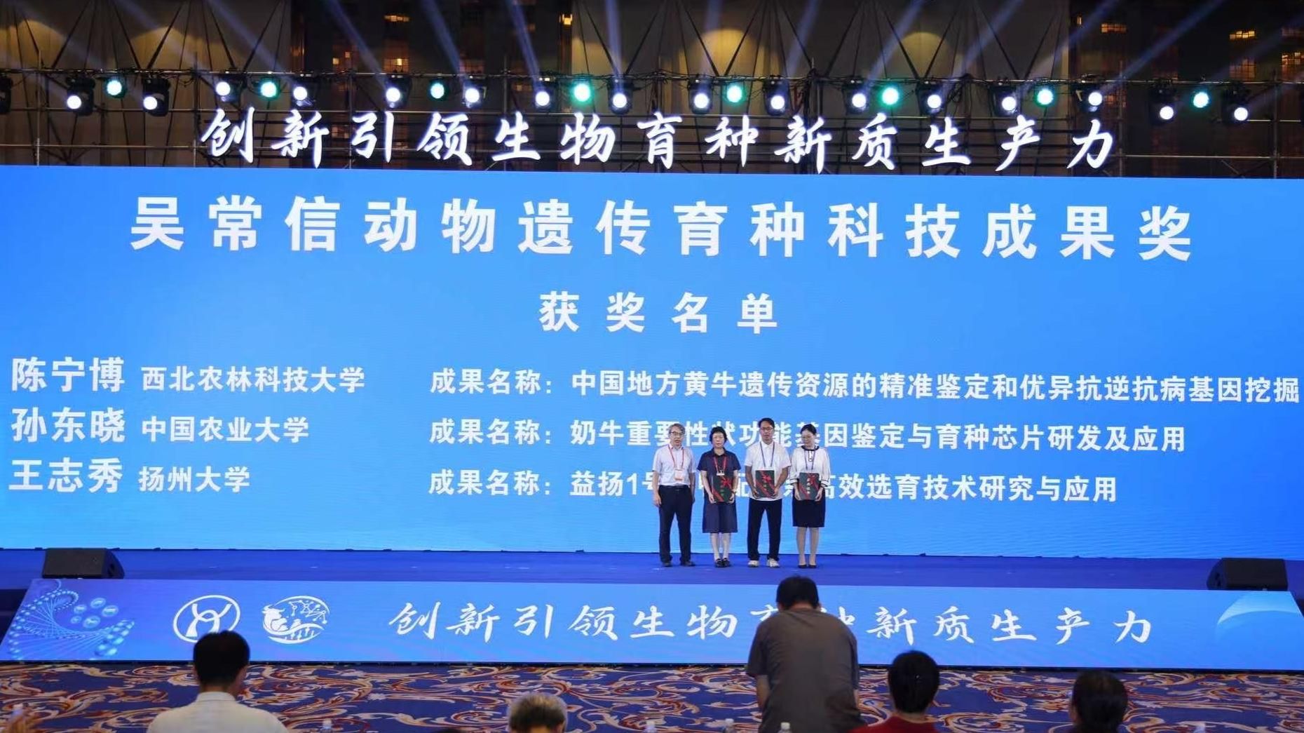 中国畜牧兽医学会动物遗传育种学分会名誉理事长杨宁、华中农业大学教授赵书红、东北农业大学教授李辉,为获奖代表颁发“吴常信动物遗传育种奖励专项基金”科技成果奖、生产与推广成果奖、教学成果奖,中国科学院动物研究所研究员赵建国、中国农业科学院农业基因组研究所研究员唐中林为志愿者颁发证书。李明洲代表学会向承办单位东北农业大学致答谢词。