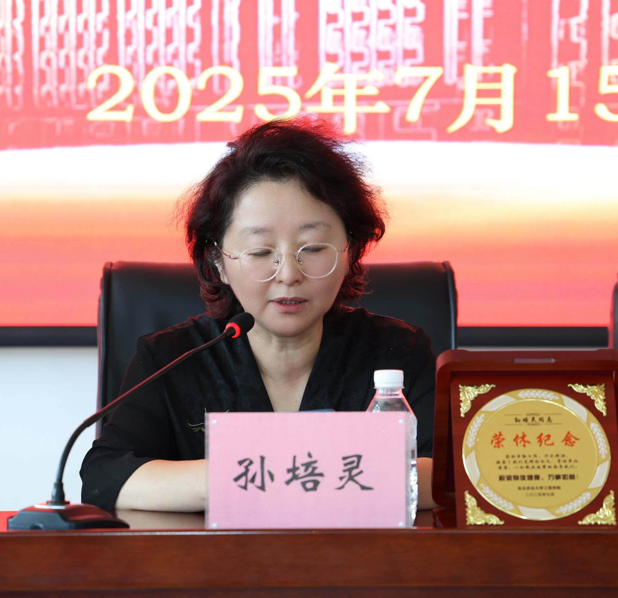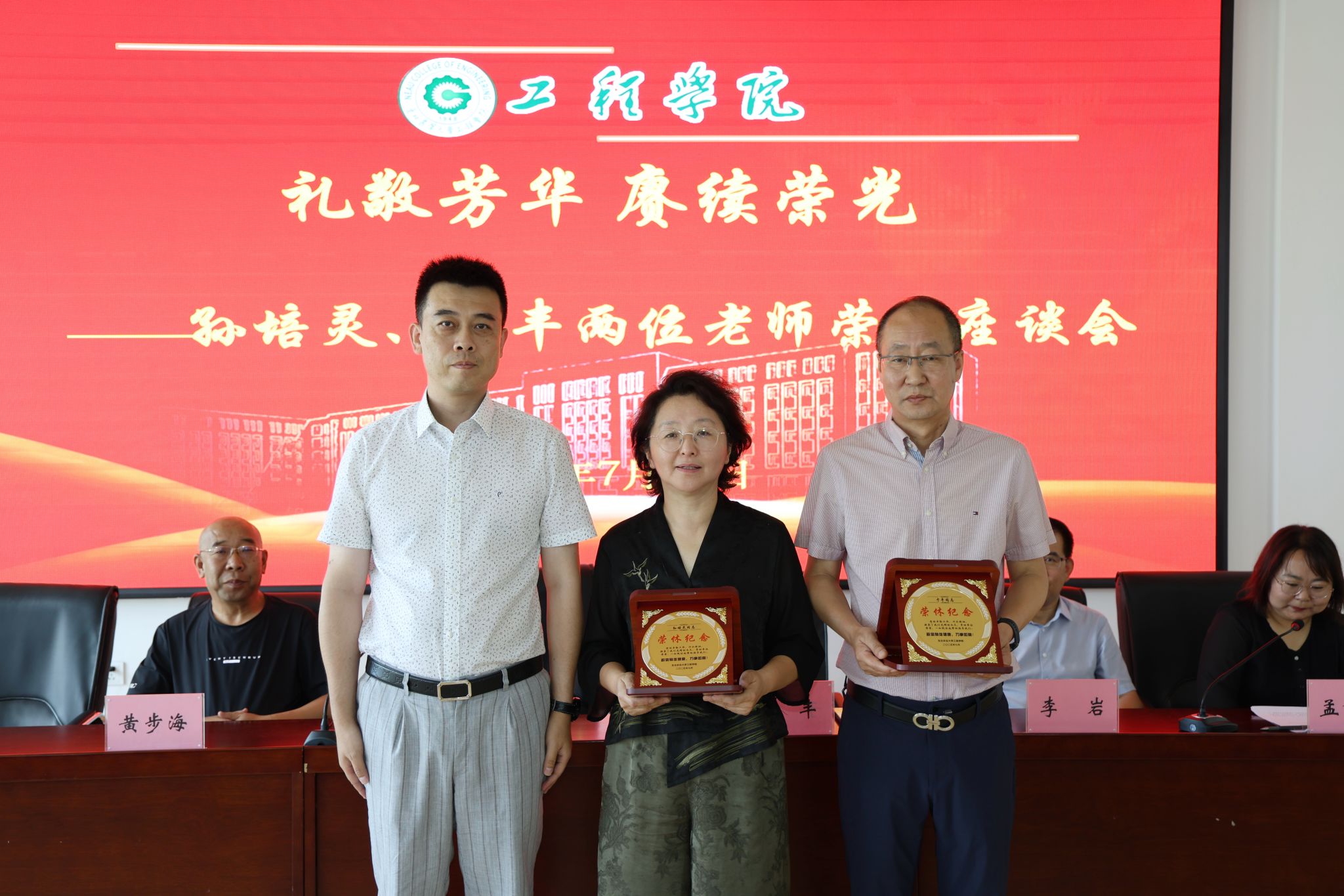 窦大昶为两位教师颁发荣休纪念铭牌,孙培灵、于丰分别讲述了自己几十年的从教经历,并表达了对学校、学院的感恩之情以及对未来发展的美好祝福。