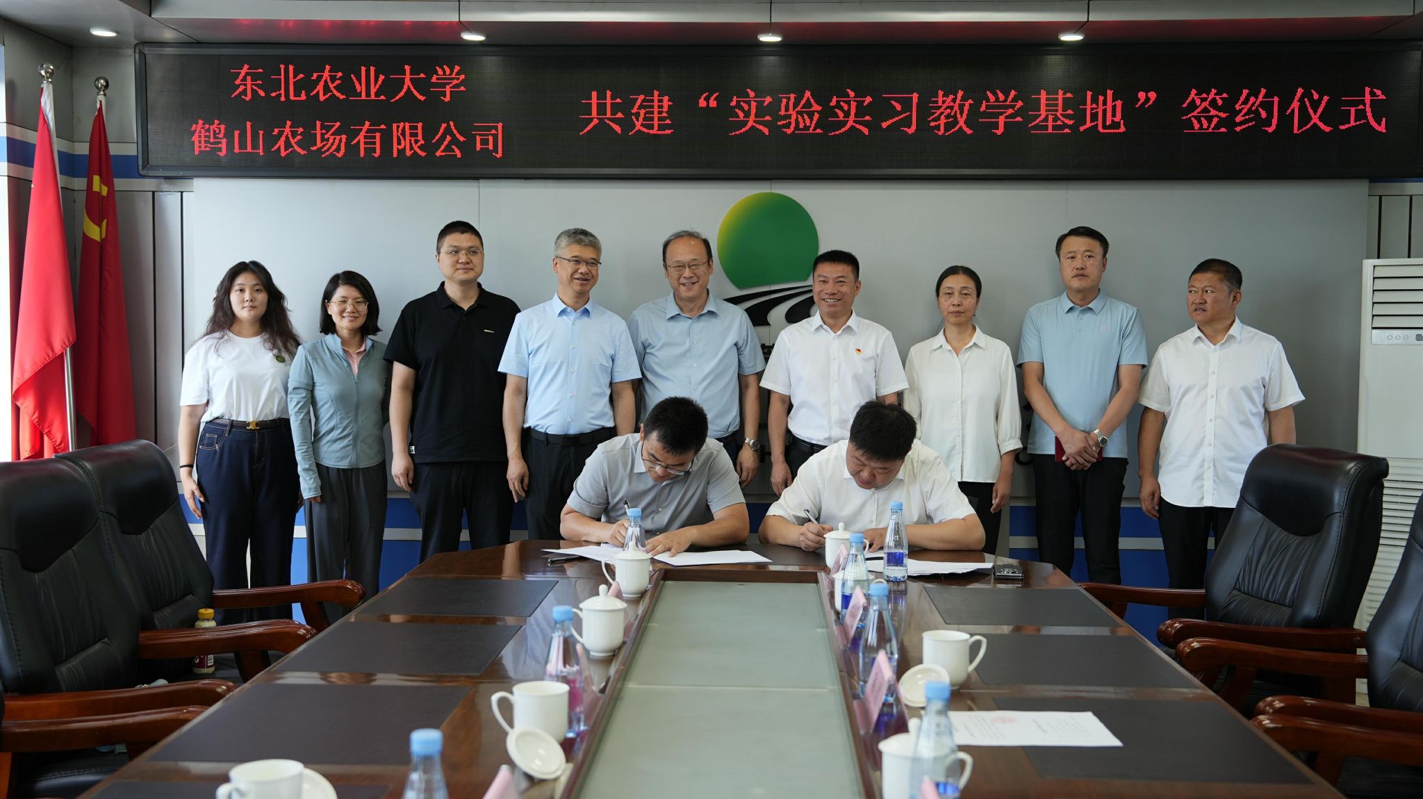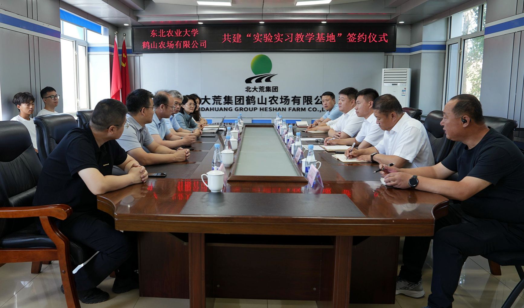 为深化校企协同育人,助力现代化农业转型升级,7月15日,研究生院院长彭胜民,农学院党委书记李晓书、院长辛大伟、副处级辅导员李东、教师张倩、辅导员郭禹含及研究生代表一行,赴黑龙江北大荒农垦集团鹤山农场有限公司协商共建现代化大农业协同育人基地,与鹤山农场有限公司签订“实验实习教学基地”协议并为农场授牌。活动由鹤山农场有限公司总经理陈震主持。