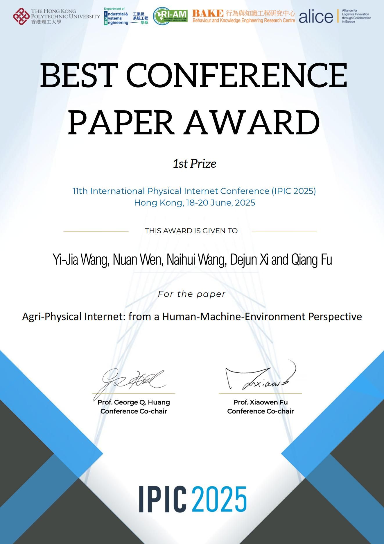 近日,第十一届国际实物互联网大会(IPIC2025)在香港成功举办,大会由香港理工大学工业与系统工程系(ISE)及先进制造研究院(RIAM)承办。我校农业水土资源高效利用团队王一甲教授的会议论文《Agri-Physical Internet: from a Human-Machine-Environment Perspective》(农业实物互联网:来自人-机-环的视角)经过严格同行评审遴选,在100余篇投稿成果中脱颖而出,荣获2025年国际实物互联网(IPIC)大会“最佳会议论文一等奖”。