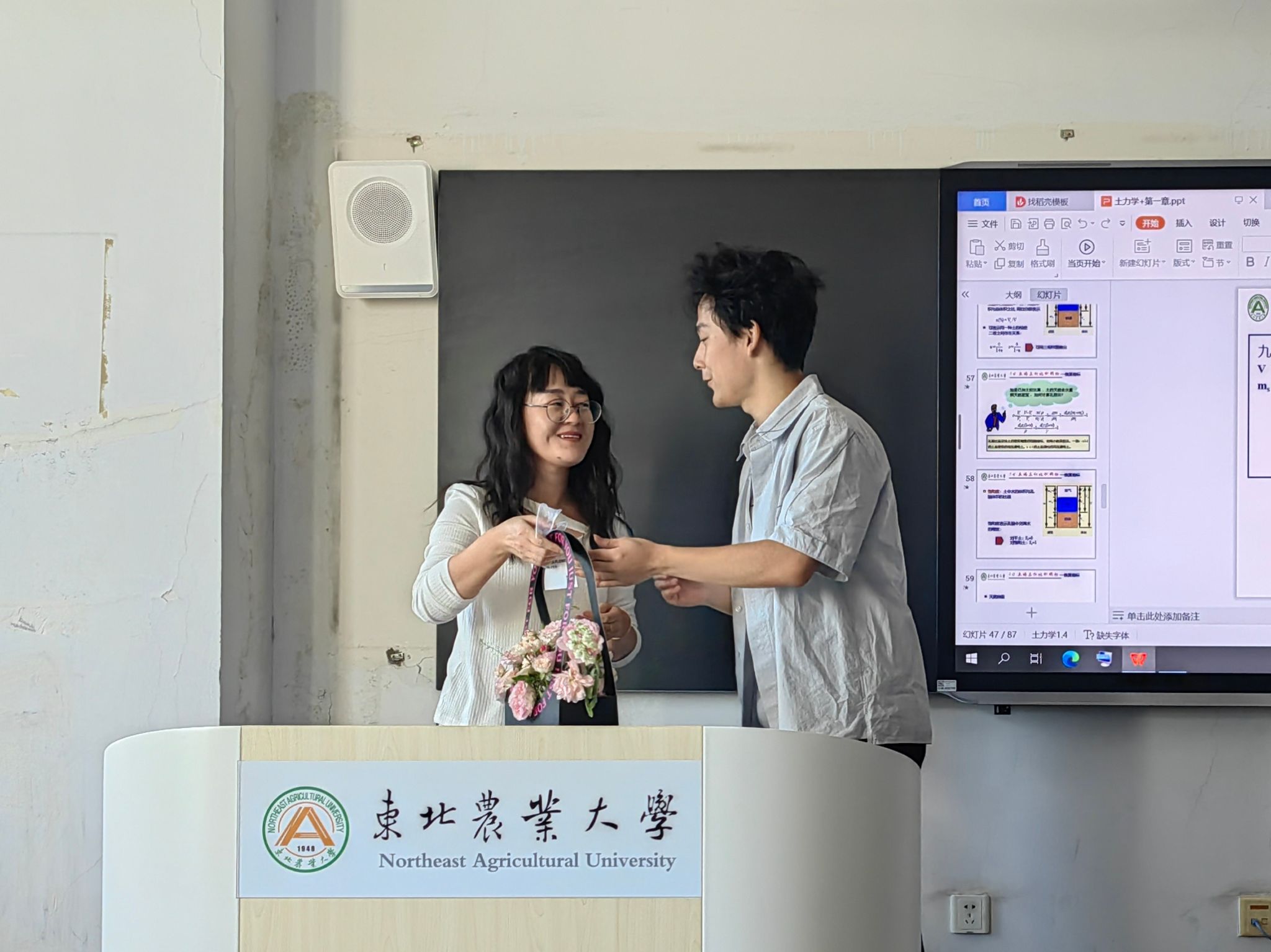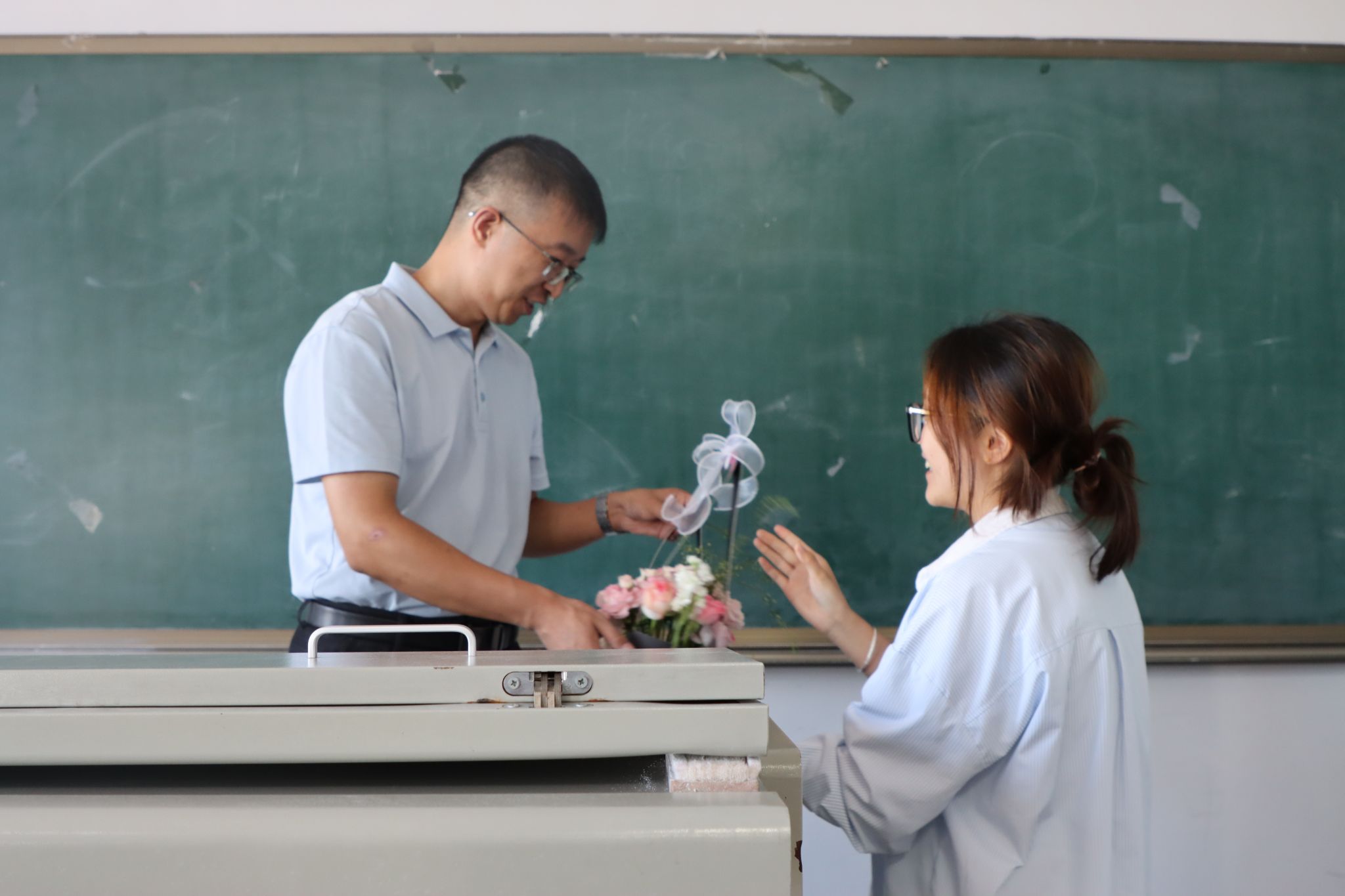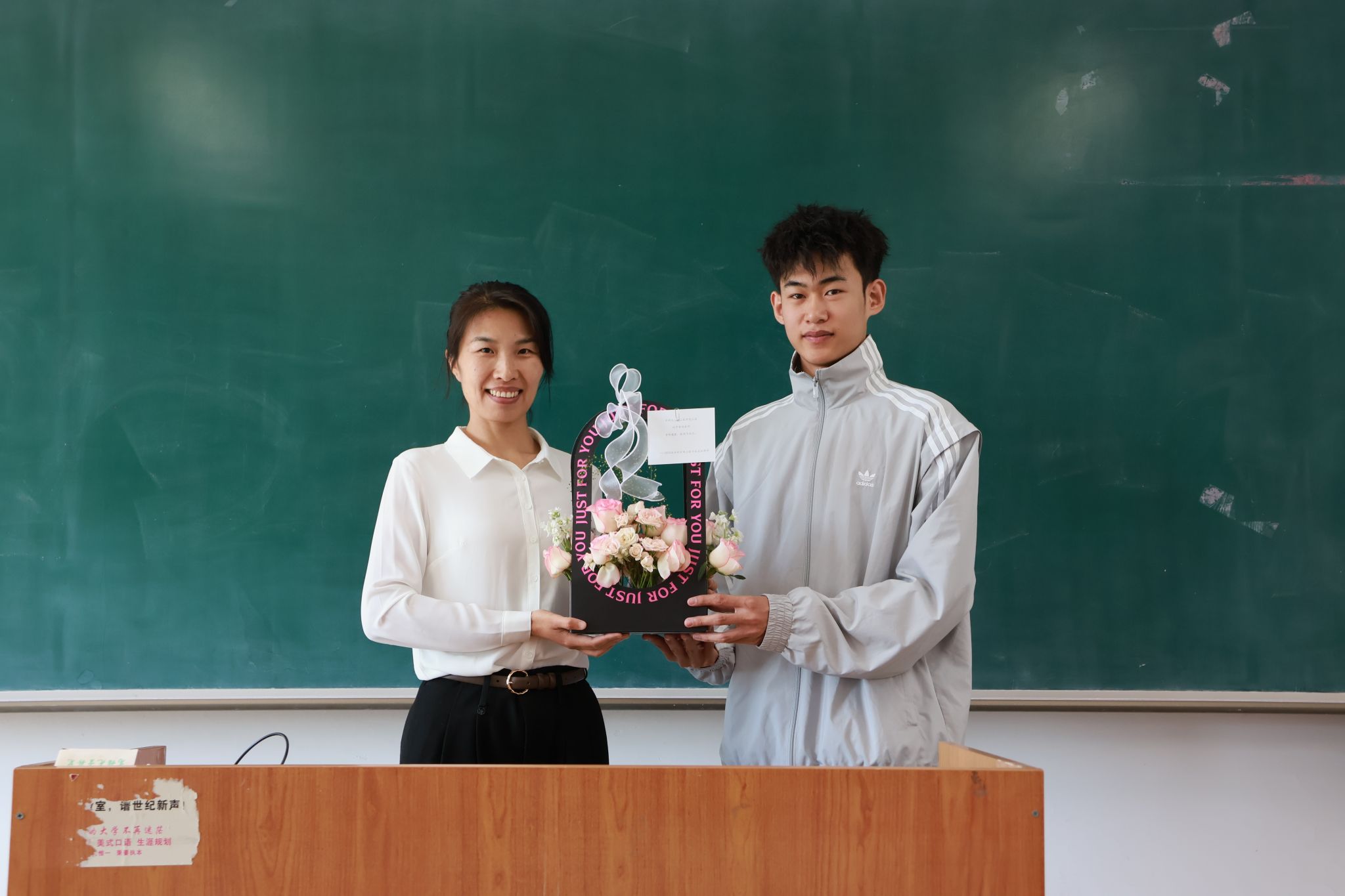 教师节当天,学院工会提前为有课教师备好了鲜花。课前,学生代表向老师献上花束,全体学生起立齐声祝福:“老师,教师节快乐!”一束鲜花、一声问候,传递出学子对老师辛勤付出的由衷感谢,也让老师们倍感温暖与光荣。