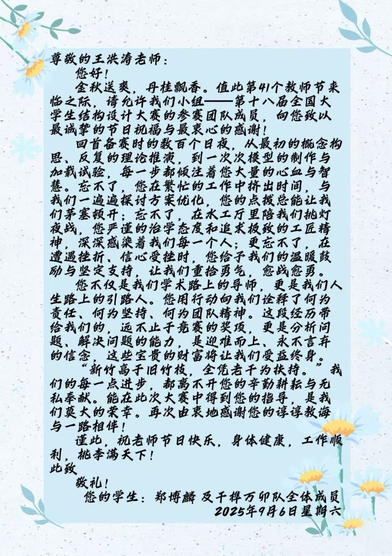 教师节当天,学院团委与学生代表一同将信件与贺卡送至老师手中。老师们认真阅读、深受感动。学生的理解和认可,成为他们最好的节日礼物。此次活动不仅为师生情感交流搭建了温馨桥梁,也让感恩之心化为实际行动,进一步弘扬了尊师重教的良好风尚。
