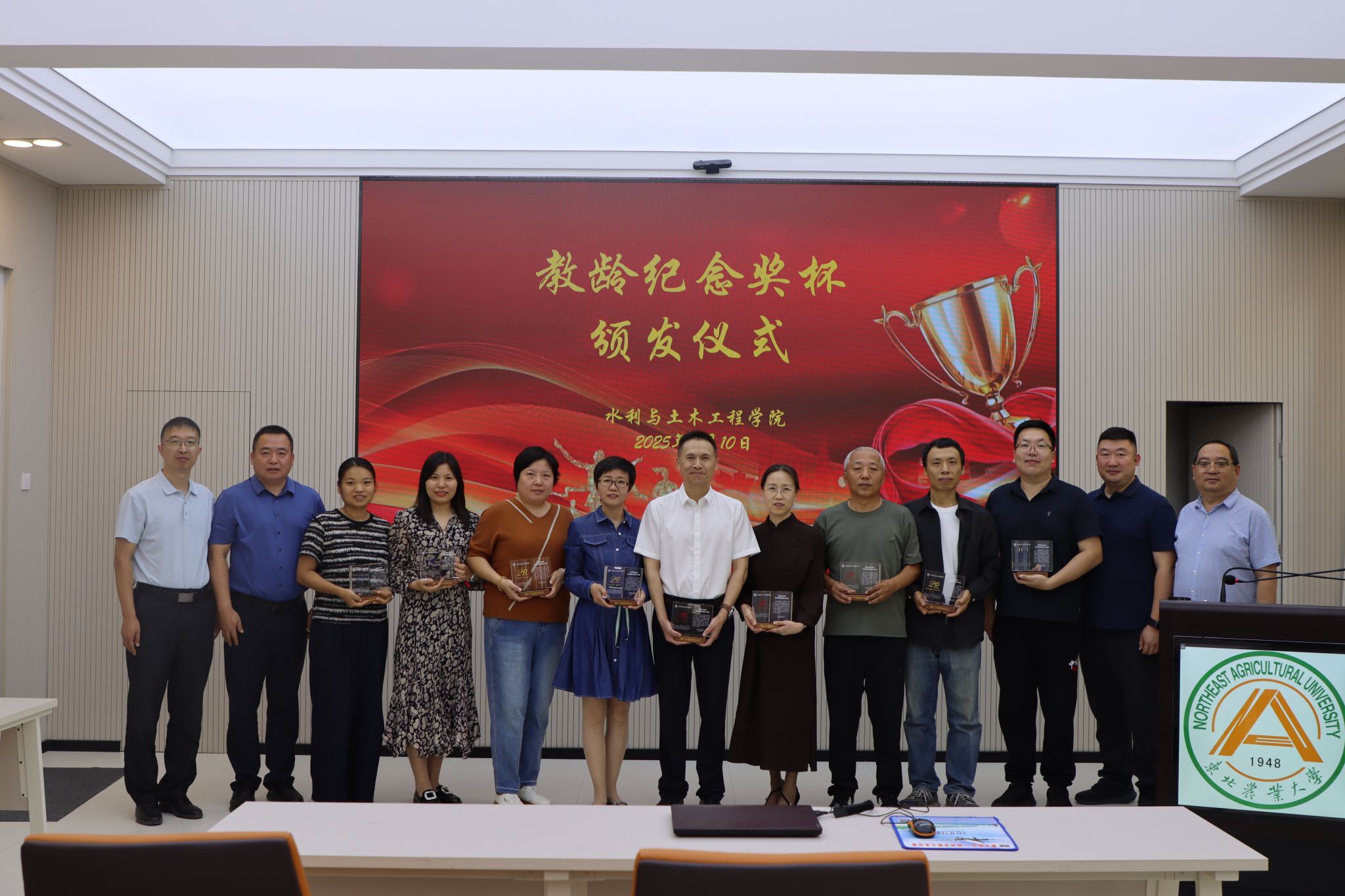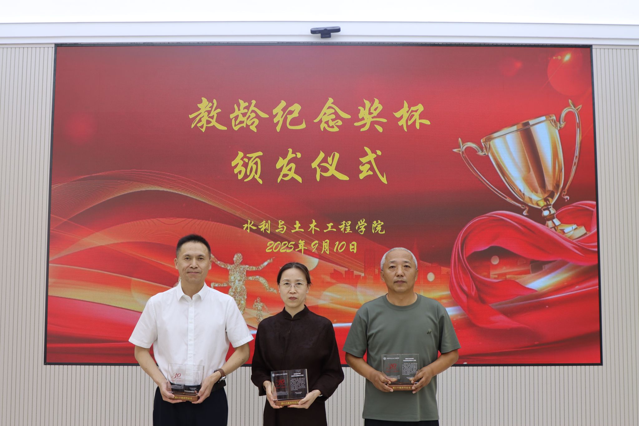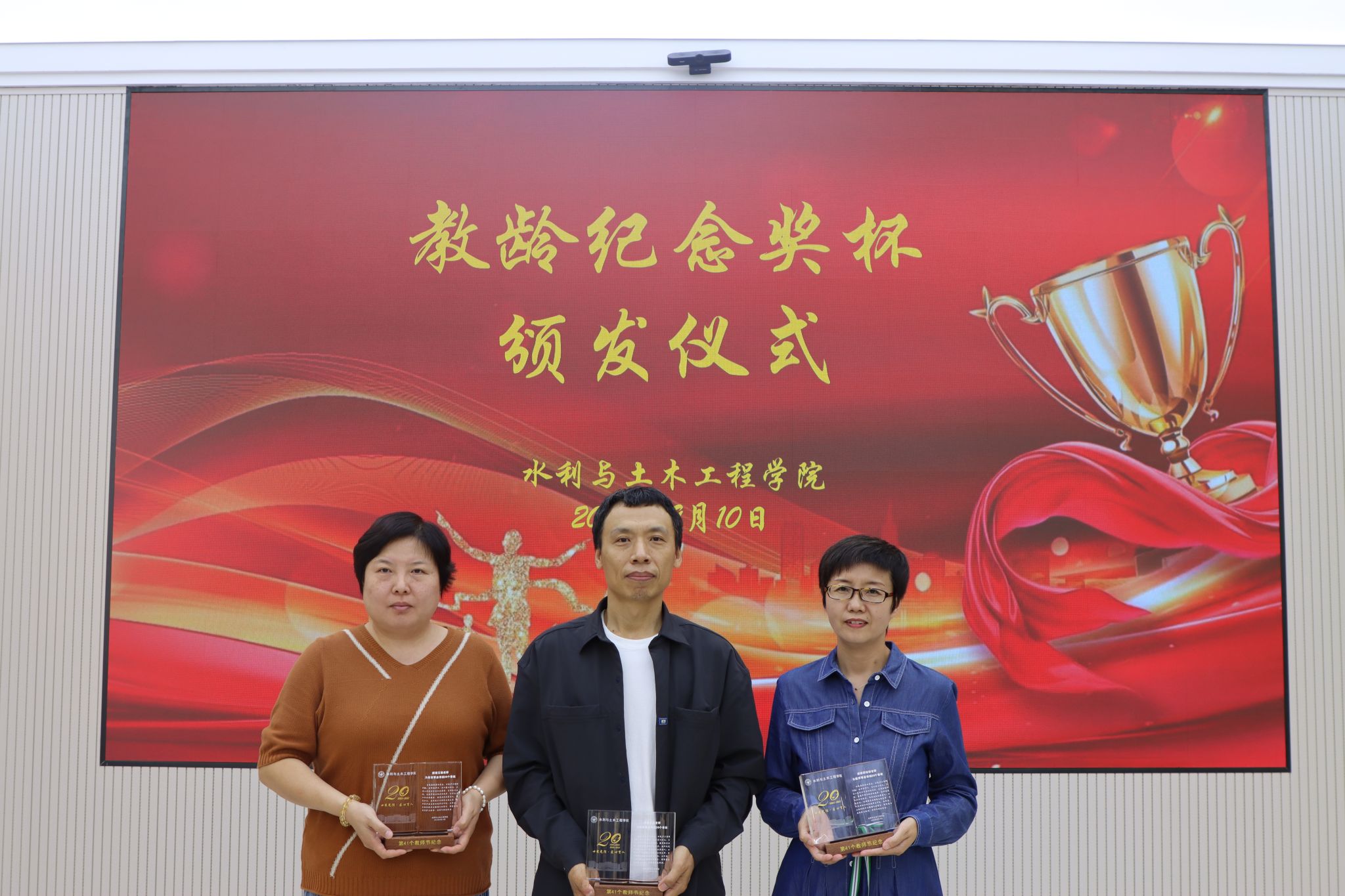 9月10日下午,学院在水利楼208会议室为从教满10年、20年和30年的教师举行教龄纪念奖杯颁发仪式。学院领导班子出席,并向各位教师颁发了精心定制的教龄纪念奖杯。