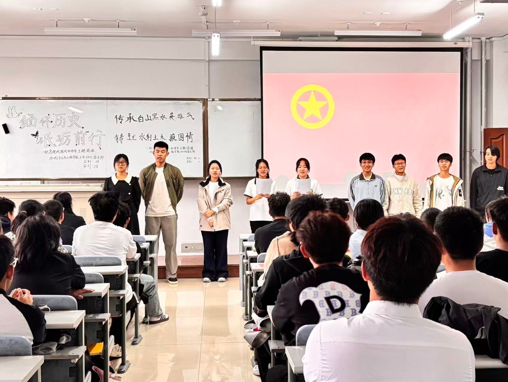 为纪念中国人民抗日战争暨世界反法西斯战争胜利80周年,水利与土木工程学院以主题团日活动为载体,通过“历史课堂+实践体验+精神传承”三维育人模式,引导新生在入学教育中筑牢爱国根基,将“铭记历史、砥砺前行”的信念转化为“强农兴农、立志报国”的求学动力。