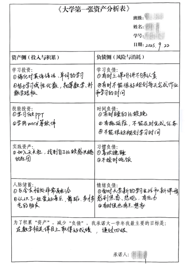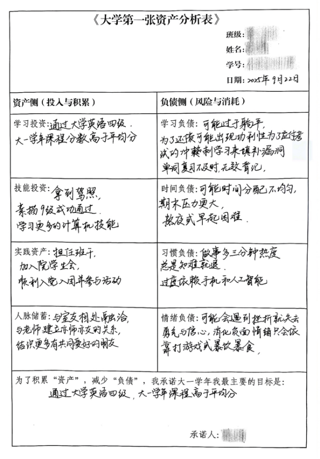 《大学第一张“资产”分析表》与专业特色有效结合。如果大学四年是一家初创公司,你作为CEO,如何分配资源让它“盈利”。大家纷纷带着问题填写,充分激发了学生们的填写兴趣。2025级新生们结合大学规划,认真梳理自己的“资产侧”与“负债侧”,将抽象的“资产-负债”财务模型与学业规划相结合。同时,大家还制作了“时光胶囊”,将每位同学的分析表统一封存,引导新生以承诺书的形式树立目标意识,辅导员也将根据大家的填写情况,提供后续个性化指导、针对性服务,让目标从“纸面”走向“行动”。