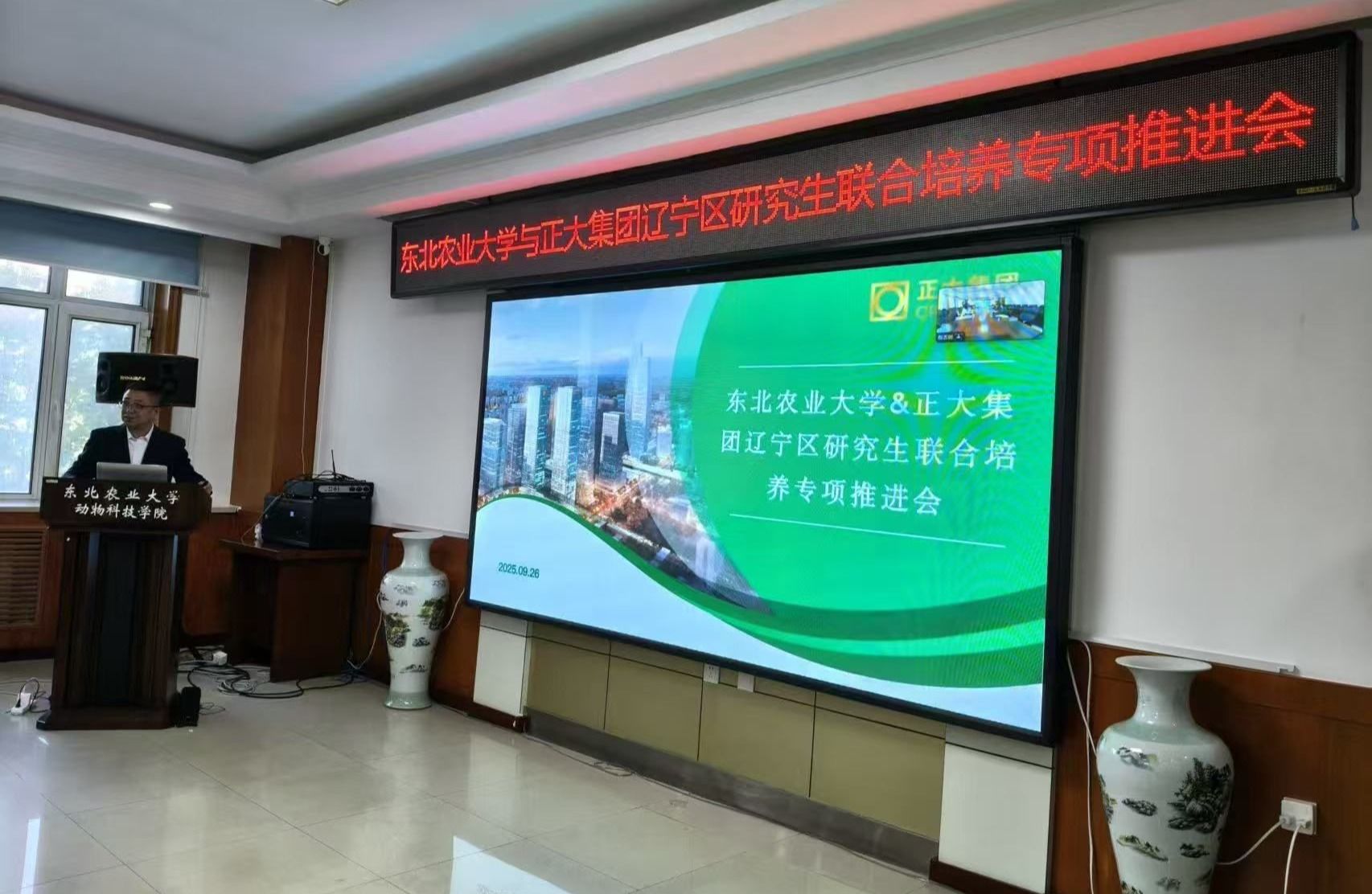 为深化校企合作,创新研究生培养模式,9月26日下午,由我校动物科学技术学院牵头举办,动物医学学院、食品学院、经济管理学院共同参与,与正大集团辽宁区联合开展的“深化产教融合·共促培养实效”研究生联合培养专项推进会在动科楼218召开。动物科学技术学院院长董娜、副院长张慧,动医学院、经管学院、食品学院及动科学院的部分教师代表参加会议,正大集团中国区副董事长兼辽宁区总裁陈强、总裁助理孙建三等企业高管通过线上线下方式出席会议。会议由董娜主持。