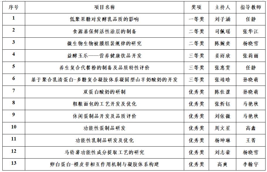 通过学生自主申报,专家评审,给予立项13项。10月15日,进行项目结题汇报答辩。结题会议由食品科学与工程系副主任孙方达担任答辩主席,学院党委副书记钱芳、粮食工程系主任王欢、乳品工程系主任杜鹏、食品营养与健康系主任刘璐、食品质量与安全系副主任王松担任答辩委员,食品科学与工程系教师李翰宇担任答辩秘书。最终评选出一等奖1项,二等奖2项,三等奖3项,优秀奖7项。