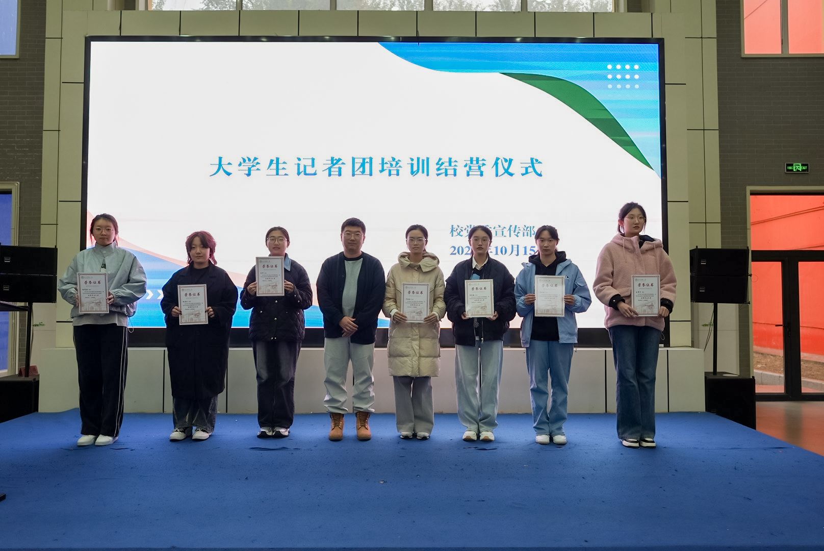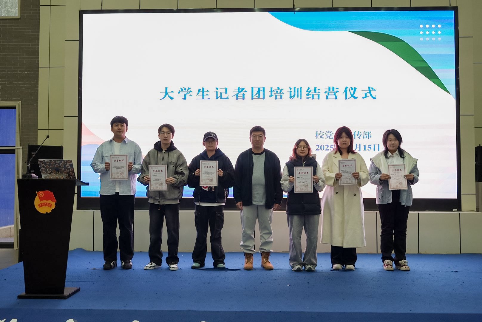结营式上,大学生记者团表彰大会同期举行。对2024-2025年度的团长、部长等颁发了聘书;对2024-2025年度的优秀学生记者颁发了荣誉证书。