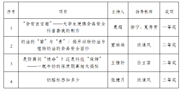 10月20日,在学校教务处、食品学院和“骆承庠”基金会的支持下,食品学院食品质量与安全系举行第四届“骆承庠杯”食品安全科普创新竞赛结题答辩会。食品学院党委副书记钱芳出席本次答辩会,食品质量与安全系副主任王松、食品科学与工程系主任夏宁、乳品工程系党支部书记李艾黎、食品科学与工程系张华江,粮食工程系谢凤英、刘天一担任答辩委员会成员,食品质量与安全系杨鑫焱担任答辩秘书。