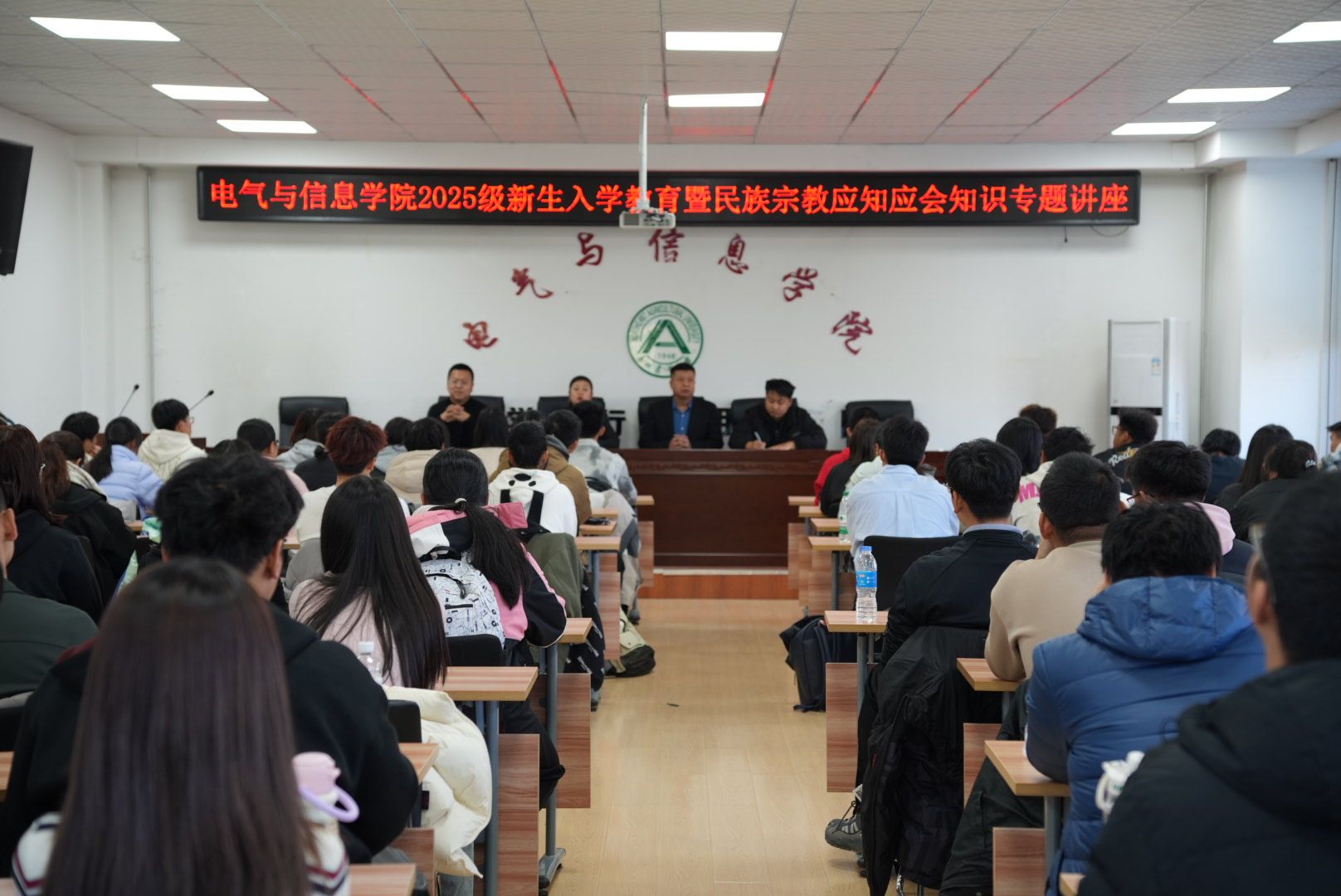为帮助2025级新生尽快适应大学环境,树立正确的世界观、人生观和价值观,同时增强对民族宗教政策的了解,铸牢中华民族共同体意识,10月21日,电气与信息学院举行2025级新生入学教育暨民族宗教应知应会知识专题讲座。学院党委副书记汪文斌,宣传兼统战委员王丽萍,新生辅导员刘贵辰、王泓臻及2025级本硕博班级骨干、寝室长参加了活动。活动由王丽萍主持。