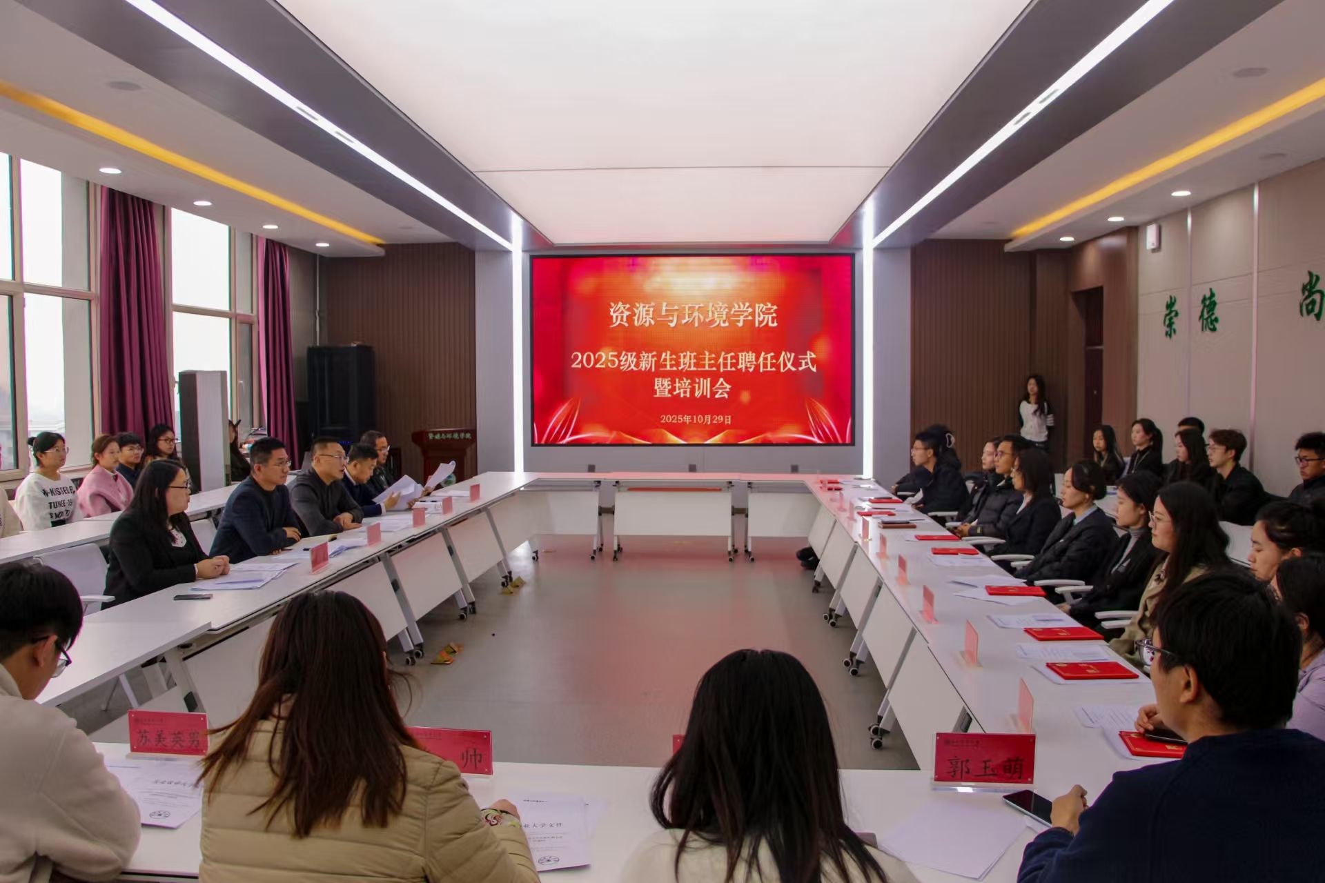 为深化落实立德树人根本任务,做好2025级本科新生的教育引导工作,10月29日,资源与环境学院在研楼718会议室举办2025级本科生班主任聘任仪式暨培训会。学院党委书记刘刹、院长曲建华、党委副书记袁洪波、副院长姜昭、院长助理宁玉翠、全体新生班主任、本科生辅导员及2025级学生代表参加此次活动。活动由袁洪波主持。