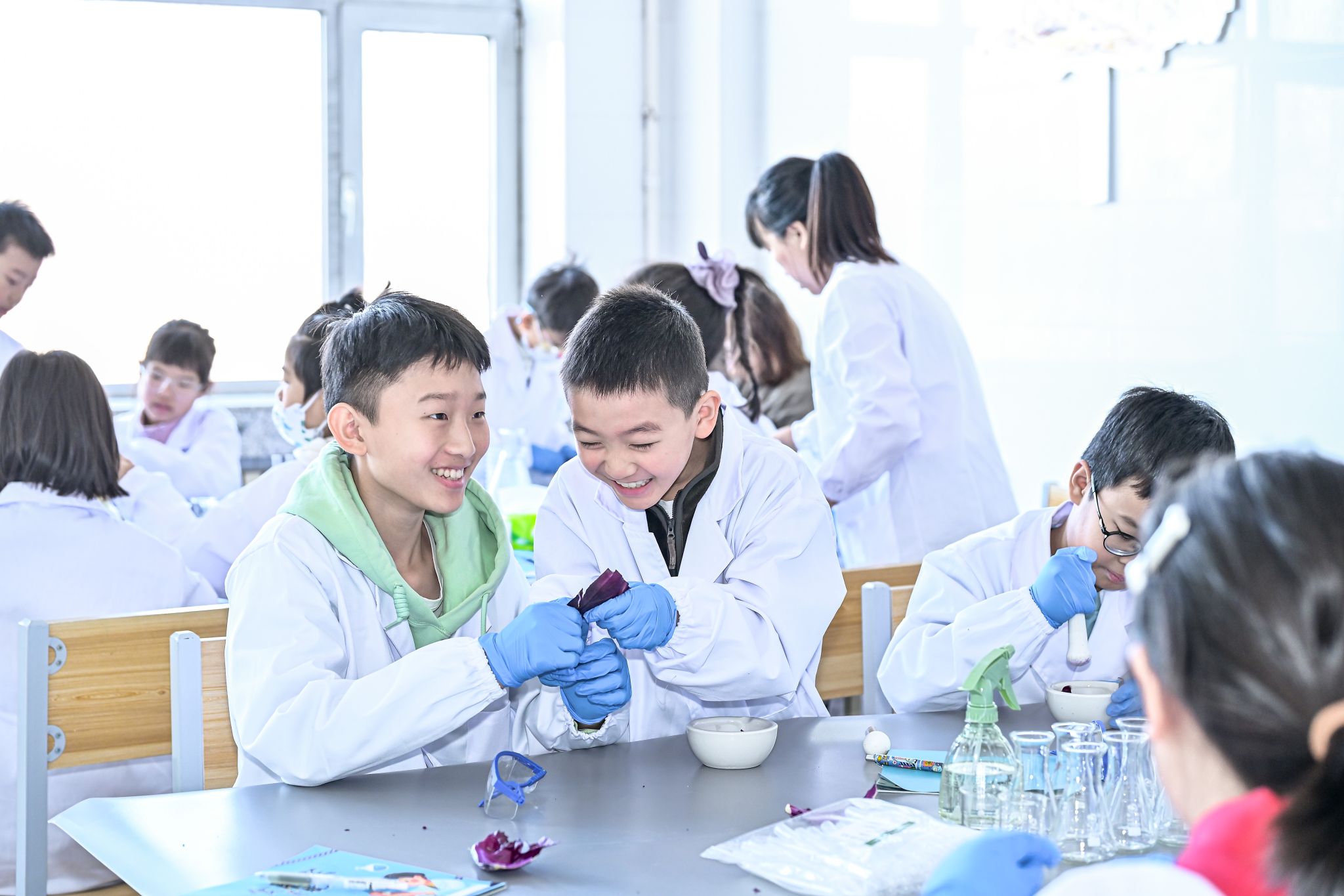 探索第二站,孩子们进入了妙趣横生的自然科学环节。在“自然界的色彩魔术师——认识花青素的色彩变化”实验室,孩子们的好奇心被瞬间点燃。大家亲手将紫甘蓝汁滴入柠檬水、苏打水等不同酸碱度的溶液中,亲眼见证了花青素这一天然色素从粉红到蓝绿的神奇变幻。这个课程打开了孩子们的“认知开关”,让他们从“被动接受食品颜色”的消费者,转变为“主动探究颜色来源”的思考者。课程展现的不只是一个有趣的实验,更是一种基于证据的辨别力,让孩子们在面对五花八门的加工食品时,能够多一份清醒地思考,做出更健康的选择。