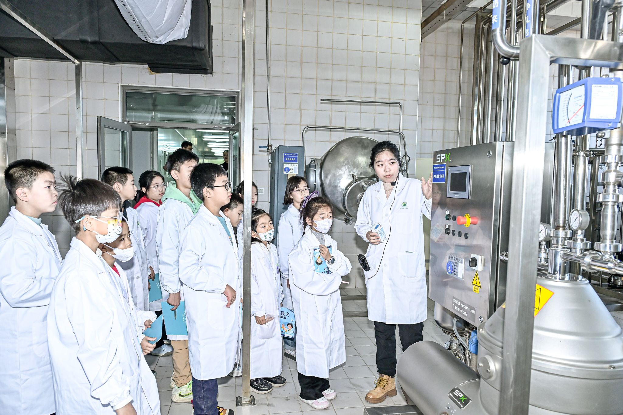 探索第一站,孩子们在科研人员的带领下走进农业农村部干乳制品加工技术集成科研基地。在这里,孩子们走进高度自动化的生产设备和洁净明亮的研发实验室,认识了乳制品中试生产线,了解了从生鲜乳到高品质奶粉、奶酪等干乳制品的现代化加工流程及营养保留、品质控制等关键技术,对日常生活中熟悉的乳制品有了全新的、更科学的认识。“原来我们喝的牛奶是这样生产的!”参观过程中孩子们不时发出惊叹,探索食品科学的种子在惊叹与思考中悄然播种。