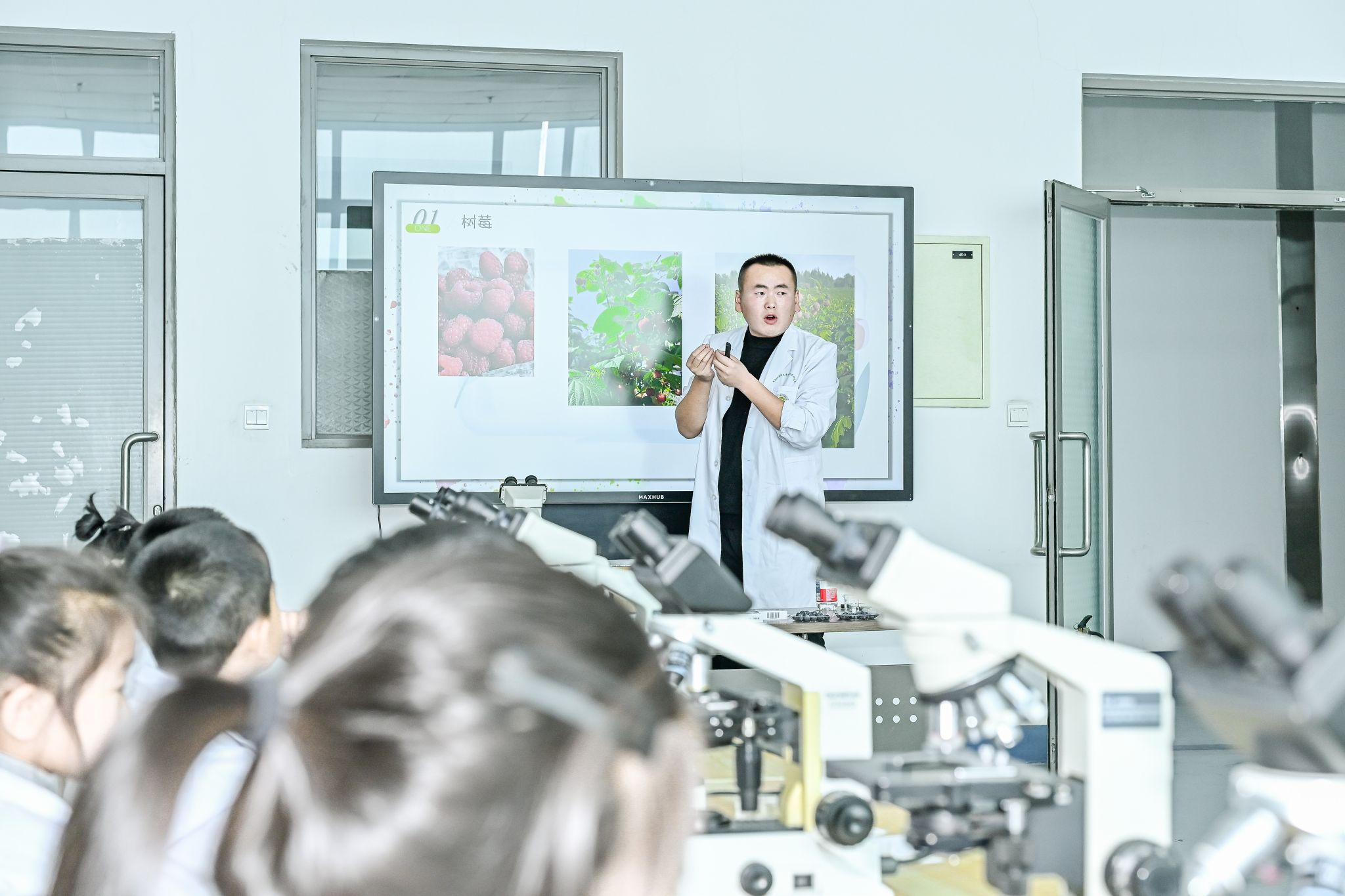 探索第三站,孩子们在显微镜下观察小浆果的细胞结构,化身“微观小科学家”。他们将蓝莓、蓝靛果等小浆果的果皮或果肉制成装片置于显微镜下,一个奇妙的微观世界豁然展现。清晰的细胞壁、饱满的液泡,甚至蕴含花青素的色泡都清晰可见。当抽象的“食物”变成屏幕上清晰的细胞结构时,孩子们领略了生物学的魅力,更直观地理解了水果色泽与营养的来源。