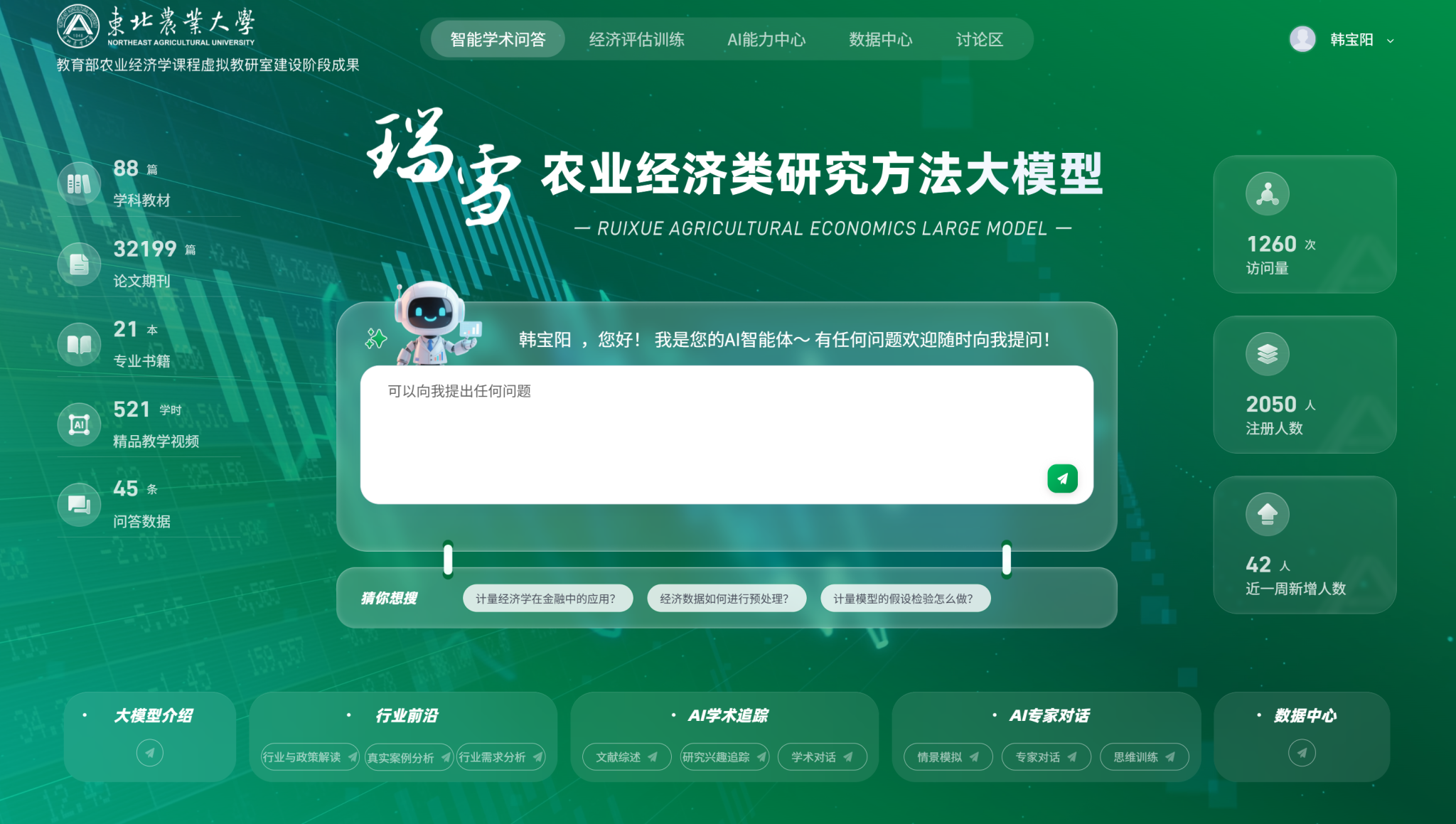 在教育部农业经济学课程虚拟教研室建设背景下,王刚毅团队开发了“瑞雪”农业经济大模型,该大模型由“农业经济政策”和“农业经济方法”两个核心功能模块组成,面向农业经济学科特点开发的垂直领域智能系统,旨在为农业经济研究、教学及政策分析提供智能化支持。