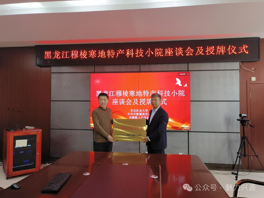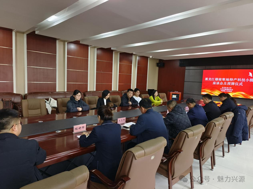 座谈会上,杜鹏围绕我校在寒地特产研发领域的学科优势、科研团队及成果积累,重点介绍了龙江工程师学院和科技小院“解民生,治学问,育英才”的人才培养模式,并介绍了我校社会合作与成果转化的新模式,为校地合作奠定了坚实基础。张希明详细介绍了兴源镇寒地特色产业发展现状及当前存在的技术瓶颈与发展难题。与会人员围绕产业升级路径展开深入交流,我校专家结合学科优势与科研成果,针对品种改良、品质提升、产业链延伸等关键问题提出建设性意见。杜鹏、张希明共同为“穆棱寒地特产科技小院”揭牌,标志着穆棱市第一家科技小院正式成立,为当地寒地特色产业发展注入了我校智力动能。