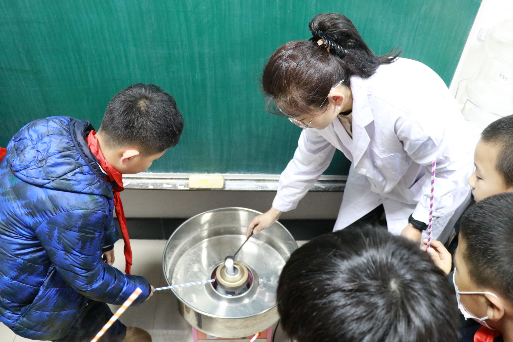 在食品学院实验室,孙立娜根据小学生的认知特点,用通俗的语言讲解实验室仪器的功能与操作原理。为让同学们直观感受科学魅力,老师现场演示棉花糖制作过程。宣庆小学学生们在老师和志愿者的指导下有序排队动手制作,在实践中体验科学原理的奇妙,感受劳动带来的快乐。