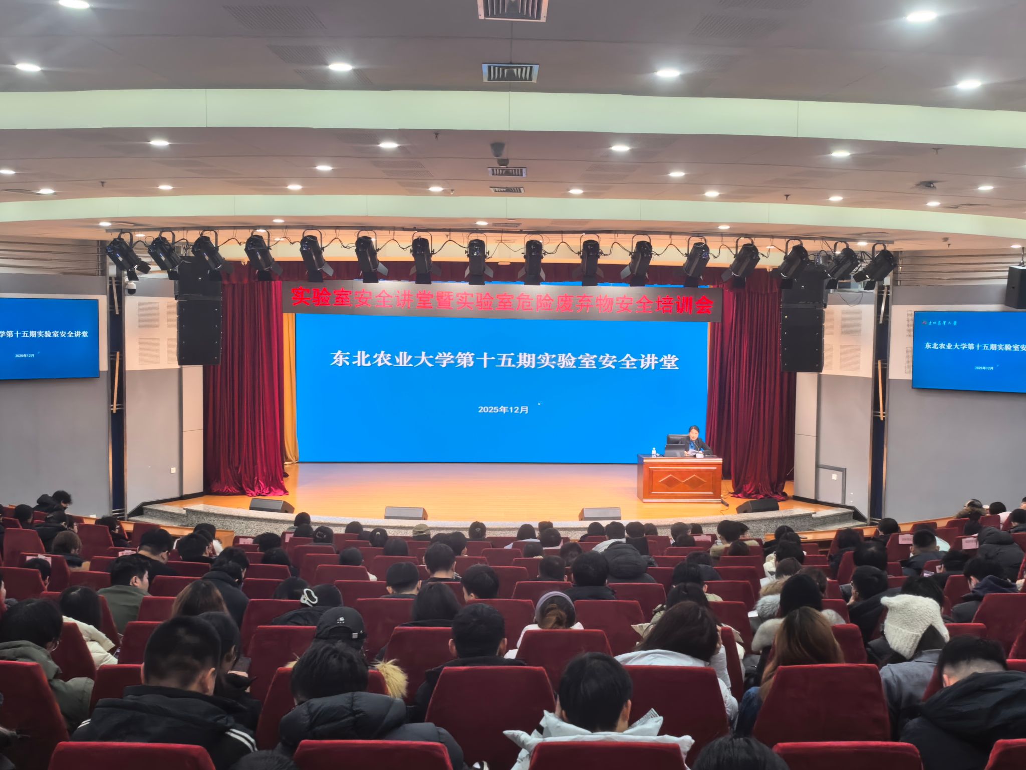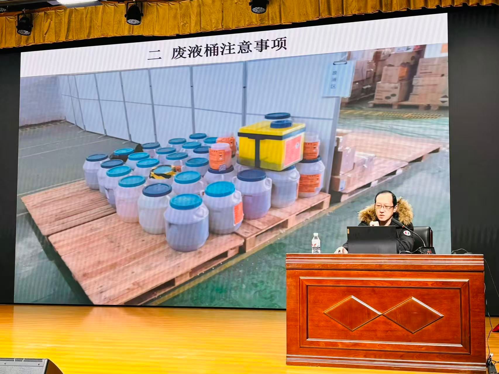 为进一步强化全校实验室安全管理水平,规范危险废物处置流程,防范实验室安全风险,12月16日下午,我校在图书馆一楼报告厅举办第十五期实验室安全讲堂暨实验室危险废物安全培训会。会议邀请实验室管理处技术安全科负责人李欣,后勤管理处节能环保科实验室危险废物处置负责人姚锐进行培训,来自公共基础教学实验中心和寒地黑土现代农业技术研究中心各科研团队的466名安全员和学生参加培训。会议由实验室管理处副处长白玉华主持。