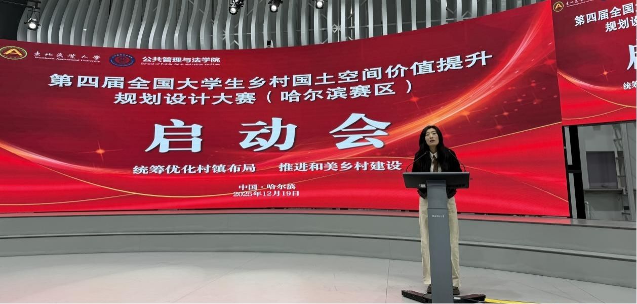12月19日上午,公共管理与法学院在成栋楼13楼大数据与智能商务报告厅召开第四届大学生乡村国土空间价值提升规划设计竞赛(哈尔滨赛区)启动会。会上,黑龙江省国土空间规划学会理事长、黑龙江省国土空间规划研究院二级教授马龙泉、我校公共管理与法学院党委书记刘世英代表承办方致辞,哈尔滨市香坊区幸福镇副镇长刘佳琪、幸福镇农村文化综合服务站农业高级畜牧师吕靳作规划设计区基本情况介绍,哈尔滨工业大学建筑与设计学院杜立柱教授、哈尔滨市城乡规划设计研究院正高级工程师朱明受邀作专题报告,同时黑龙江省土地学会副理事长兼秘书长王月,黑龙江省国土空间规划学会副秘书长岂野,我校公共管理与法学院副院长黄善林、人文地理与城乡规划系主任郭晶鹏及来自东北大学、吉林师范大学、长春师范大学、哈尔滨师范大学、绥化学院等高校47支参赛队伍共150余名师生代表参加此次活动。黄善林、郭晶鹏分别主持致辞环节和专题报告环节。
