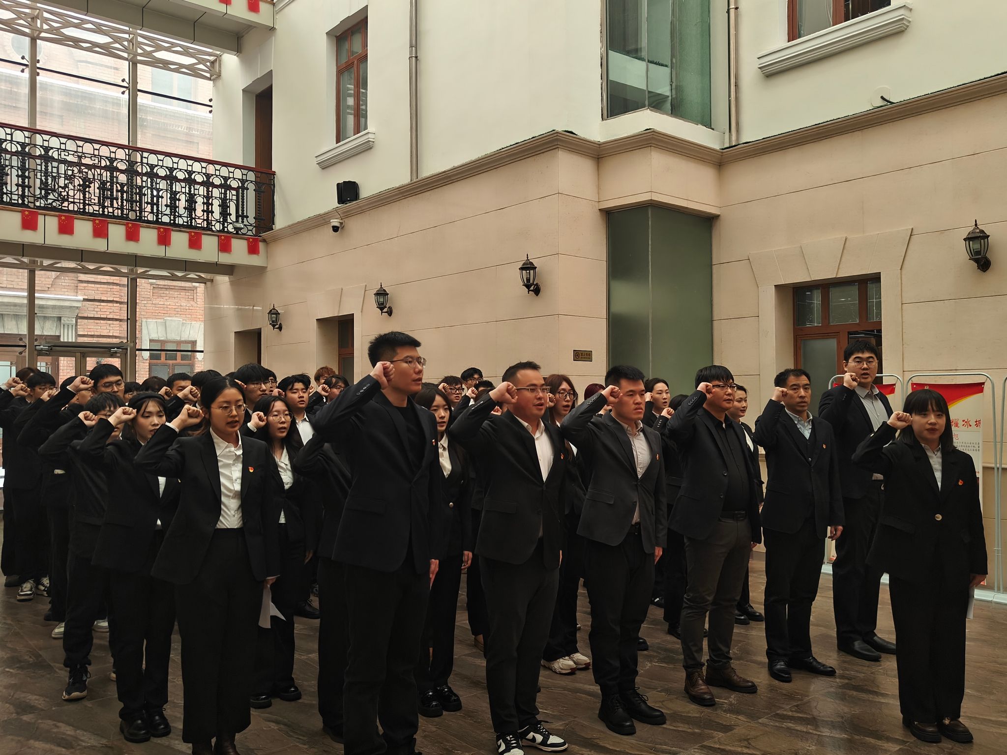 参观结束后,全体人员在党史纪念馆的阳光大厅中庄严肃立,在学院党建中心指导教师陈红宇的领誓下,面向党旗进行了新党员入党宣誓、老党员重温入党誓词的庄重仪式。