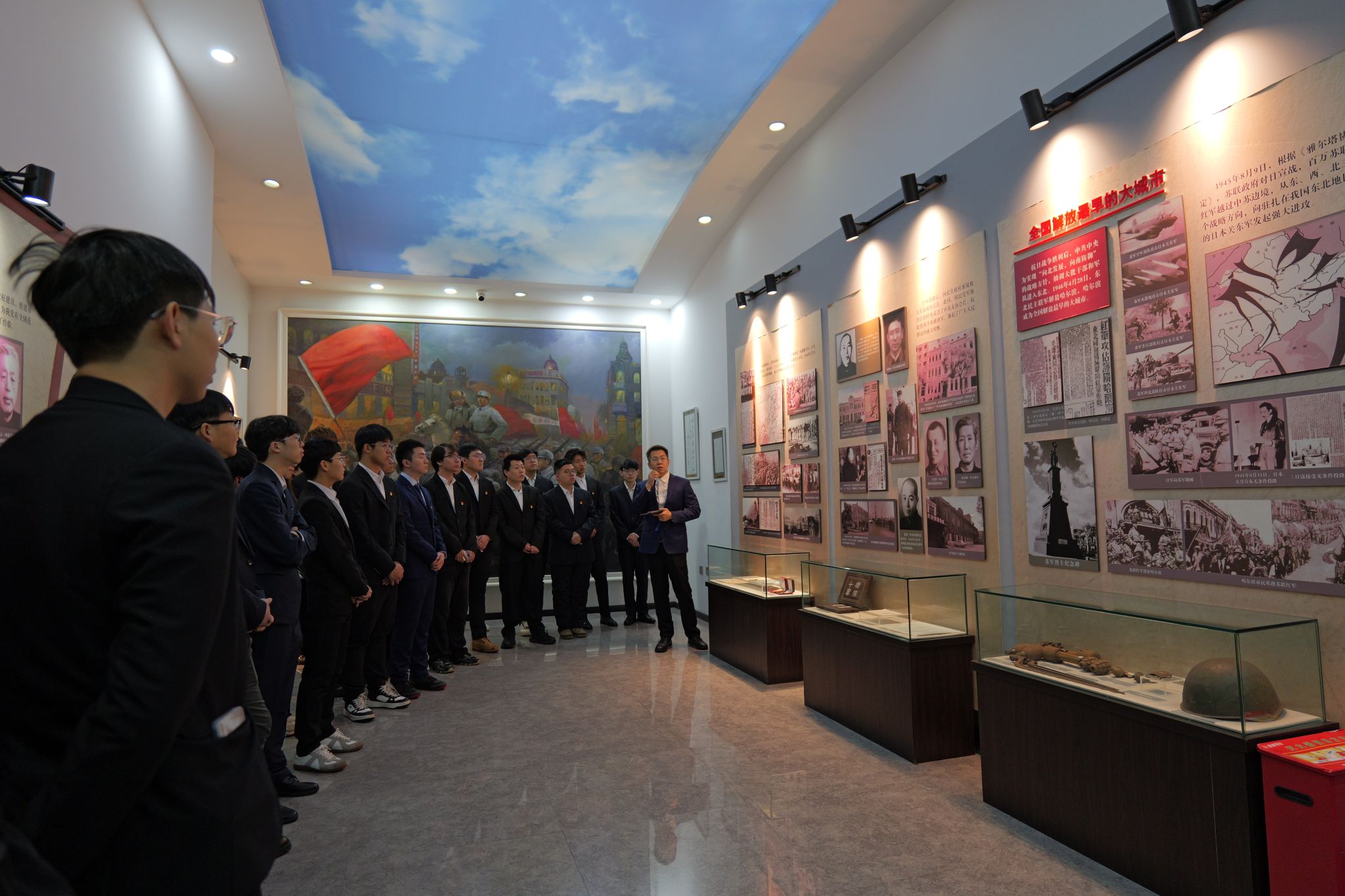 到达党史纪念馆后,全体师生在讲解员的引导下沿着时间脉络,通过一幅幅历史画面、一件件革命文物的实景展示,深入了解了中国共产党在哈尔滨地区领导革命、建设、改革的光辉历程。