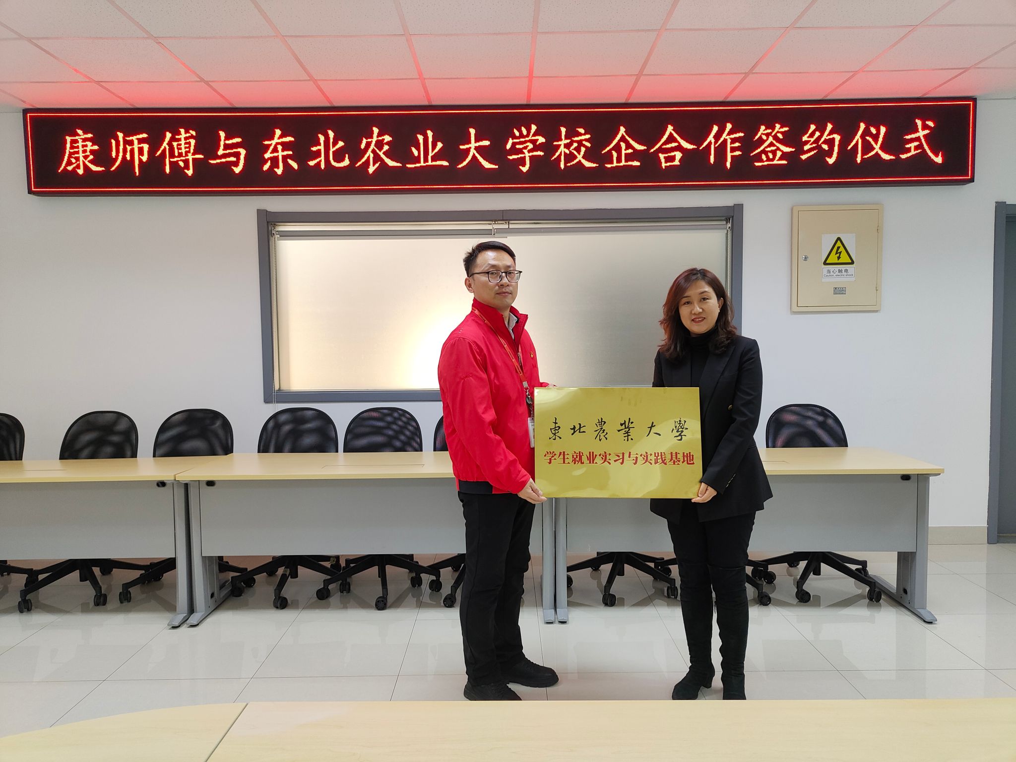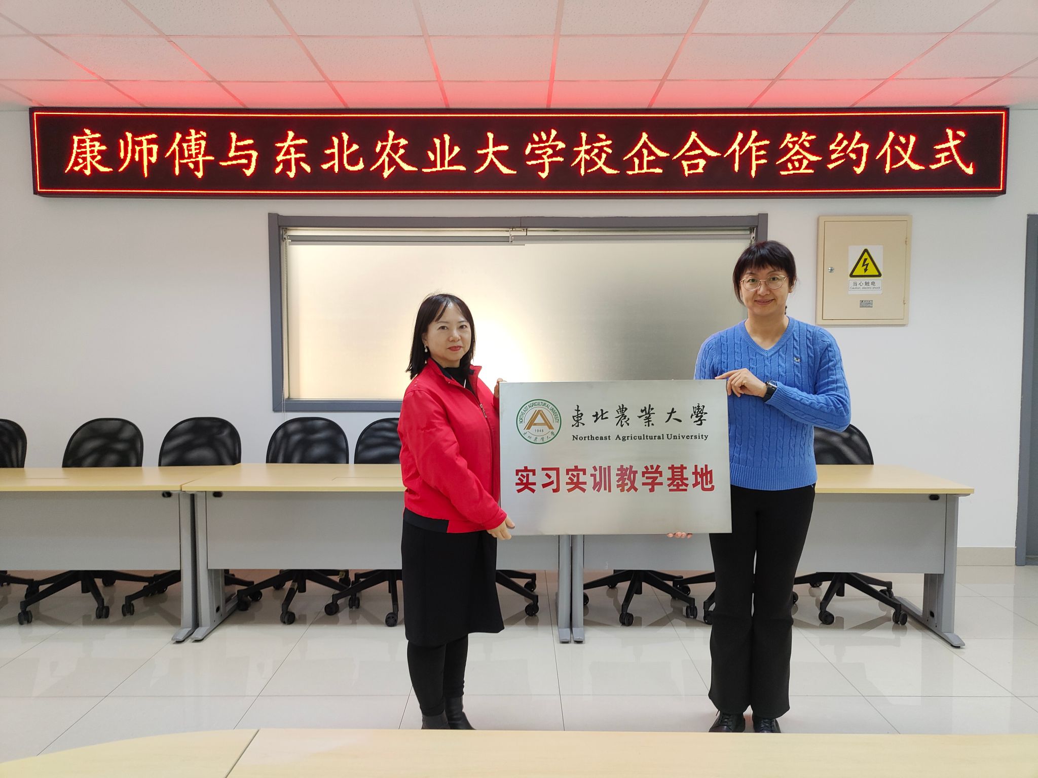 双方代表共同签署《校外本科实验实习教学基地协议书》。随后,食品学院代表向企业授予“学生就业实习与实践基地”“实习实训教学基地”牌匾,企业方代表接牌,全体与会人员合影留念。
