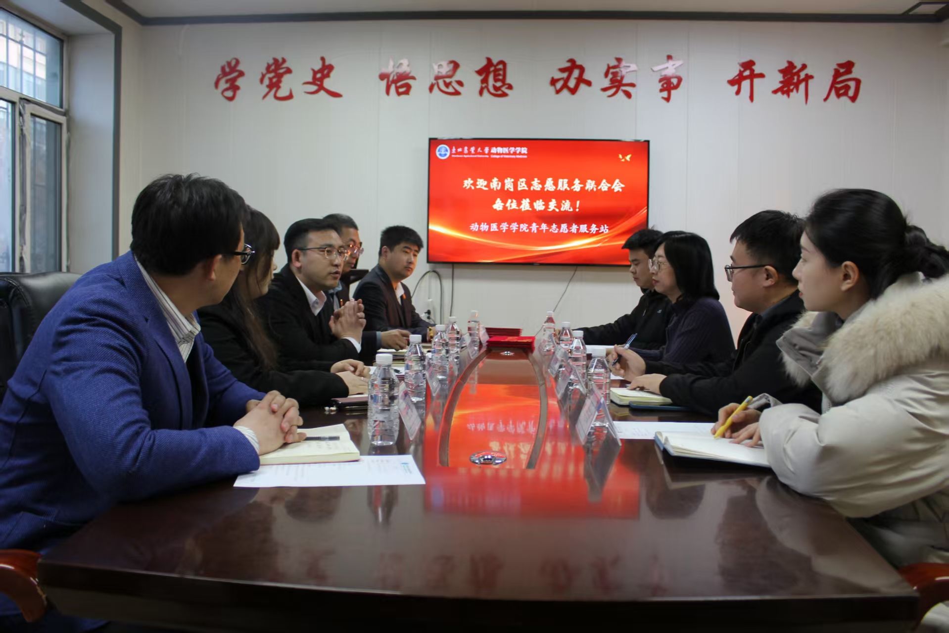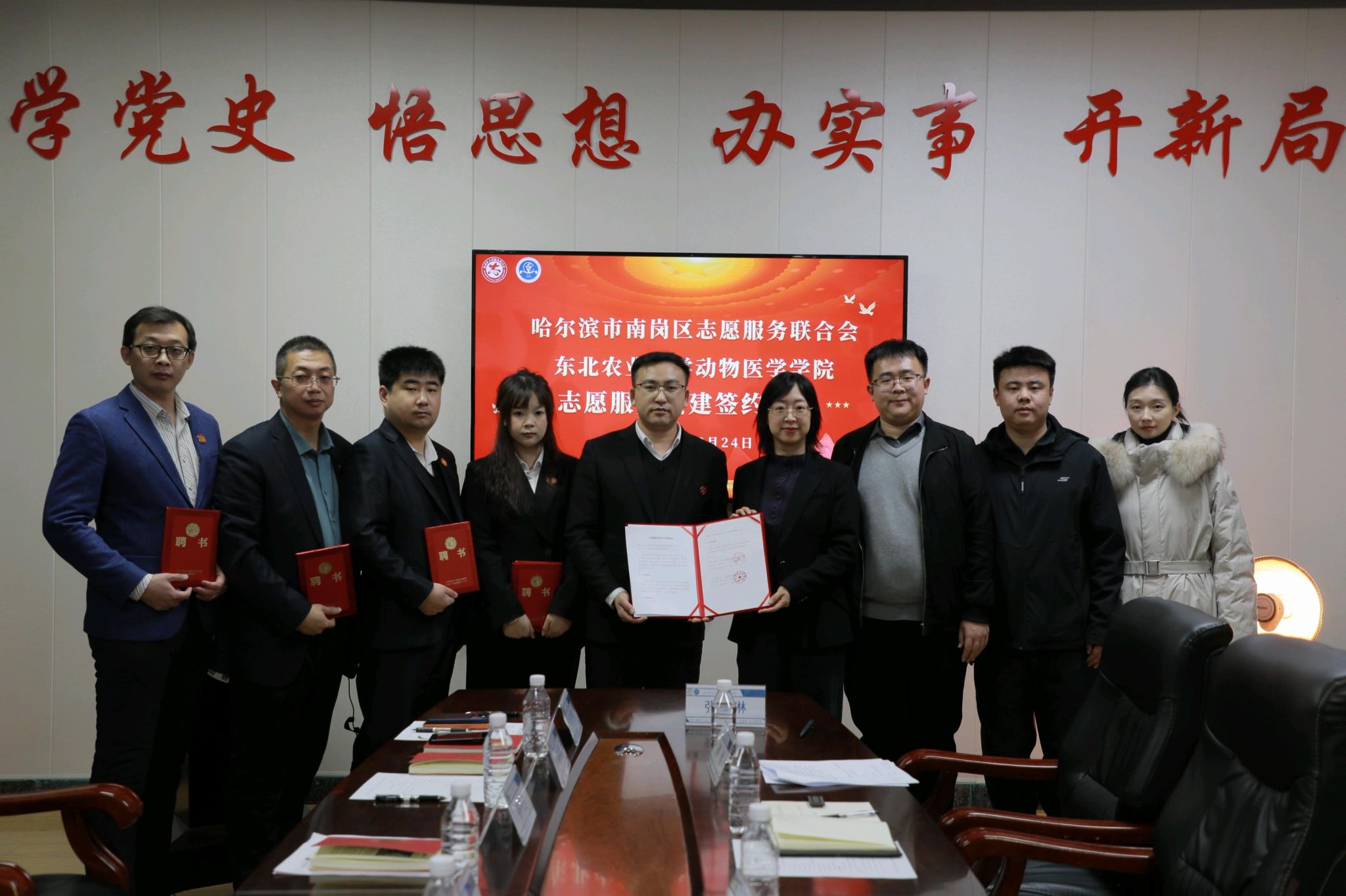 为深入贯彻落实《关于健全新时代志愿服务体系的意见》部署要求,弘扬“奉献、友爱、互助、进步”的志愿精神,推动校地志愿服务协同发展,12月24日,动物医学学院与哈尔滨市南岗区志愿服务联合会在牧医楼202会议室举行志愿服务项目共建签约仪式。南岗区志愿服务联合会会长滕兆达,秘书长金宇婷,副秘书长孙涛、王亚辉,外联部部长刘志明,动物医学学院党委副书记张鑫琳,团委负责人邹云飞,辅导员李佳琦、韩伟出席仪式。仪式由张鑫琳主持。