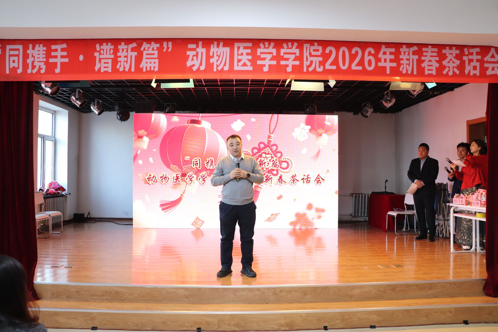 新岁序开,肇启新章。为增强教职工凝聚力、向心力,充分展现学院教工团结奋进、昂扬向上的精神风貌,12月31日下午,动物医学学院在临床教学医院举办“同携手·谱新篇”2026年新春茶话会。学院领导班子成员及全体教职工齐聚一堂,共叙情谊、同迎新春。茶话会由青年教师吴志勇、仇天新、王馨笛、马景龙主持。