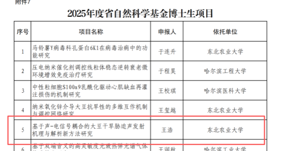 近日,黑龙江省科学技术厅公布了2025年度黑龙江省自然科学基金博士生项目评审结果,电气与信息学院2024级博士研究生王浩申报的项目“基于声—电信号耦合的大豆干旱胁迫声发射机理与解析新方法研究”获得立项资助。